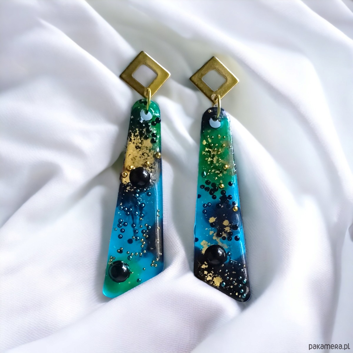 elementy z żywicy umieszczone na ozdobnych sztyftach z pozłacanej stali szlachetnej (nie uczula).