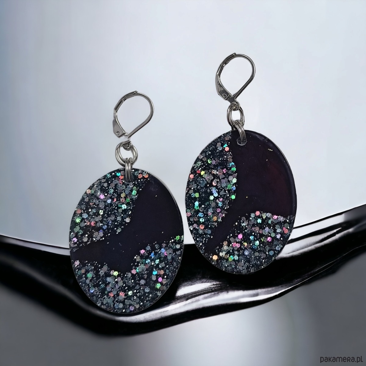 unikatowe kolczyki wykonane z transparentnej i transparentnej grafitowej żywicy z dodatkiem brokatu i cekinowych diamencików (holograficzne).