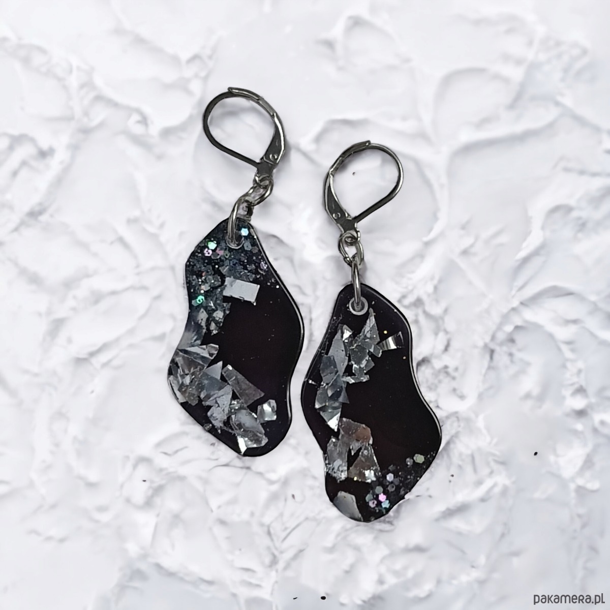 unikatowe kolczyki wykonane z transparentnej i transparentnej czarnej żywicy z dodatkiem brokatu holograficznego i srebrnej ciętej folii (efekt tłuczonego szkła)
