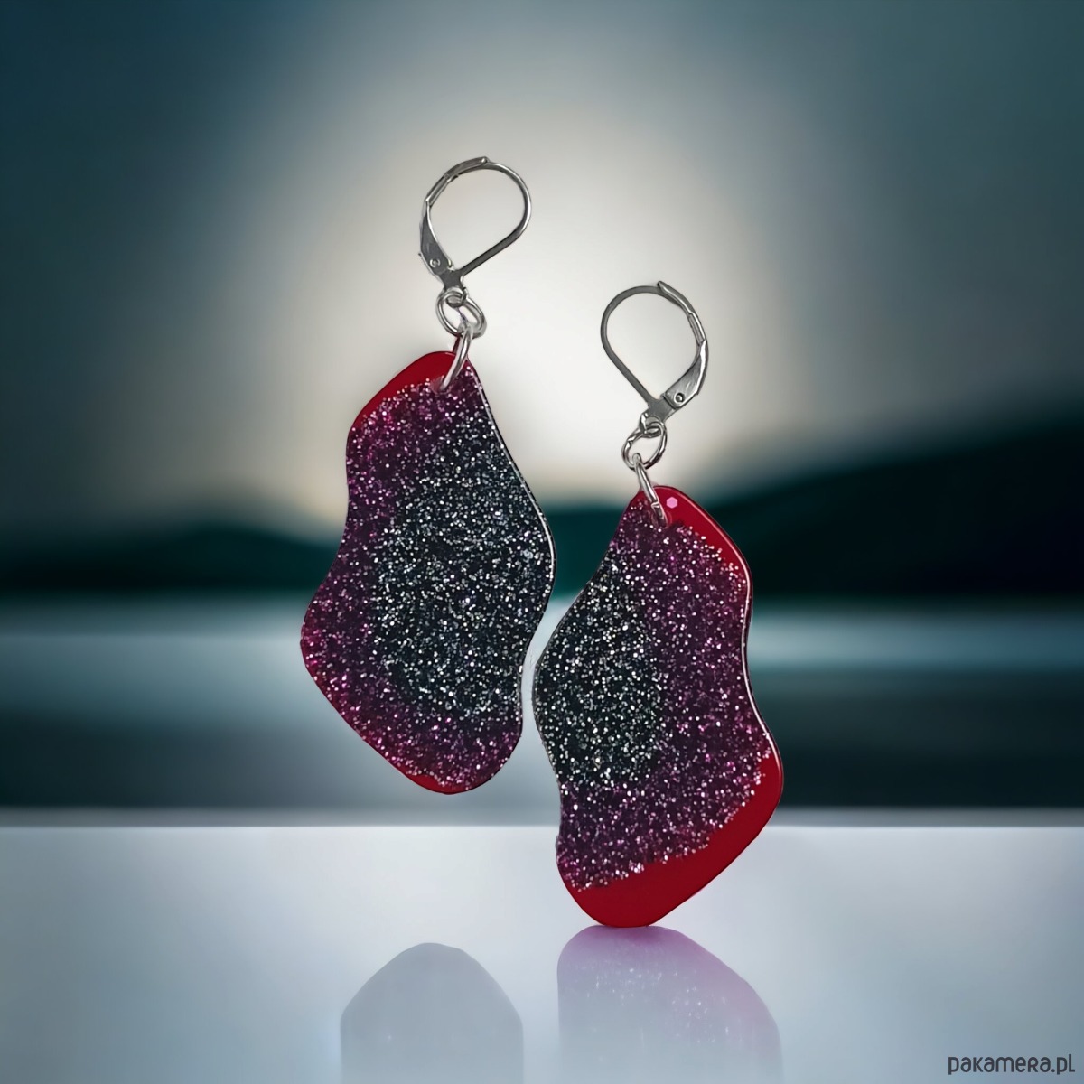 unikatowe kolczyki wykonane z transparentnej i transparentnej czarnej oraz wiśniowej żywicy z dodatkiem brokatu.