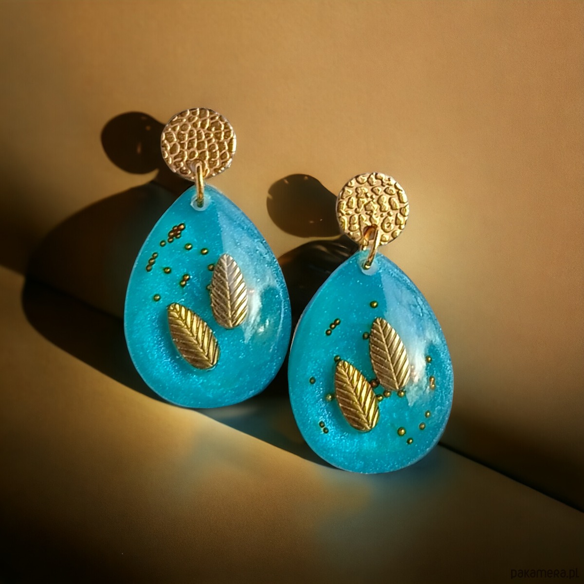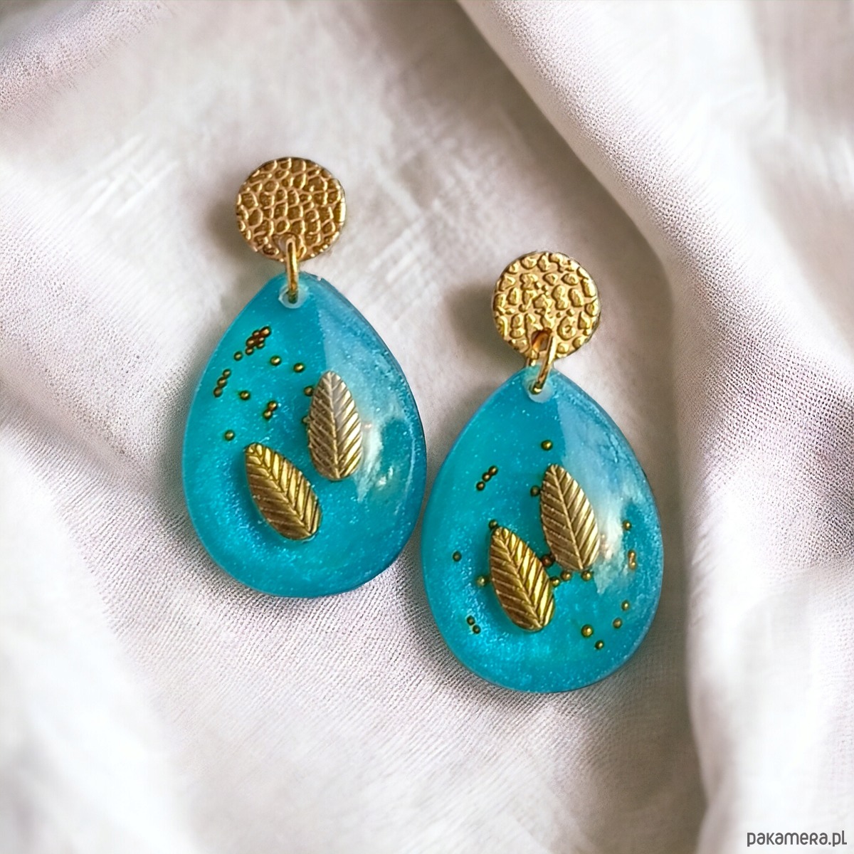 unikatowe kolczyki wykonane z transparentnej i turkusowej, perłowej żywicy z dodatkiem złotego szklanego kawioru i listków ze złotego hematytu.