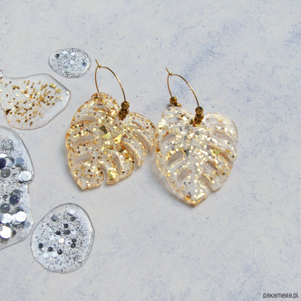 niezwykle efektowne kolczyki wykonane z transparentnej żywicy z zatopionymi złotymi drobinkami.