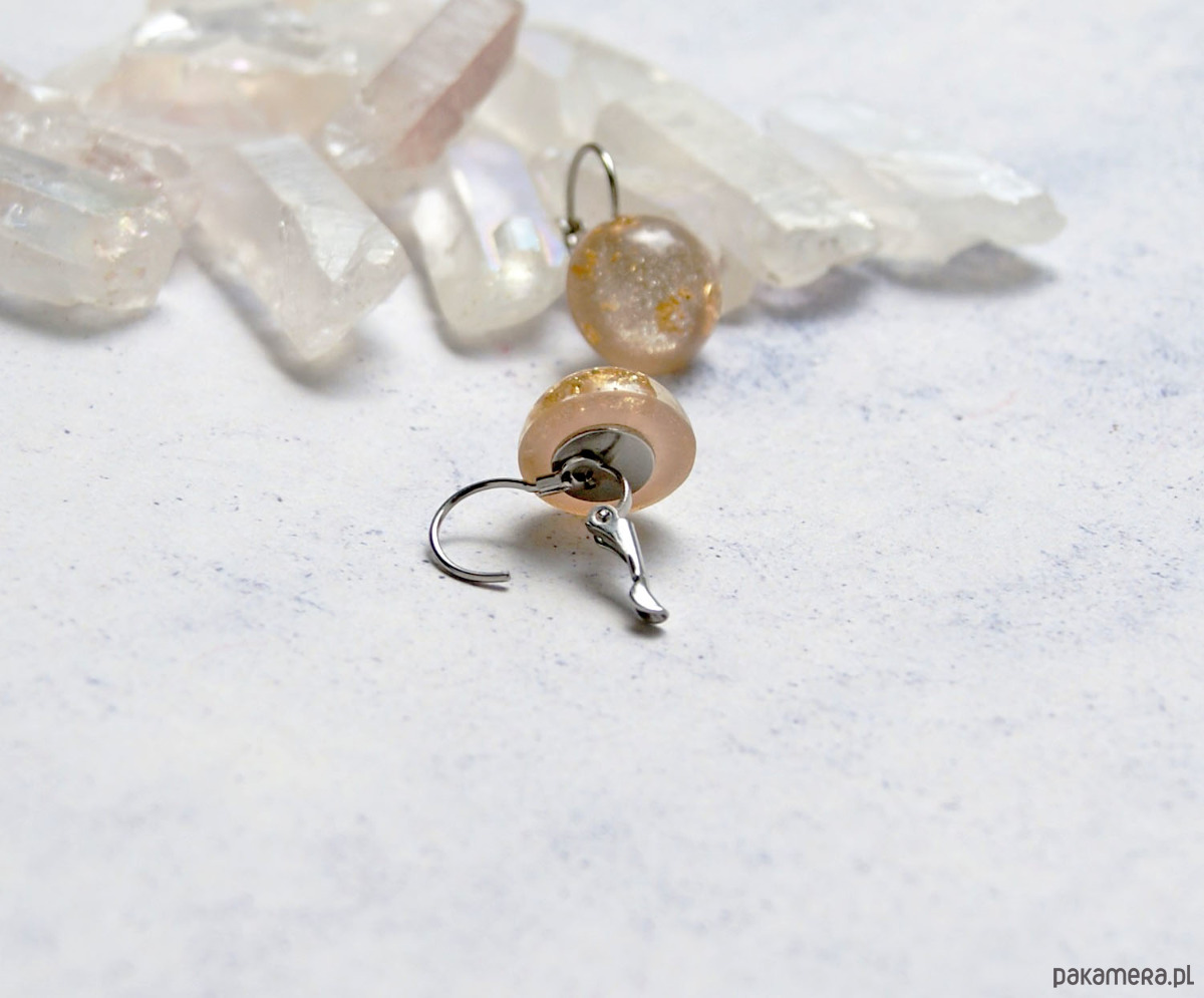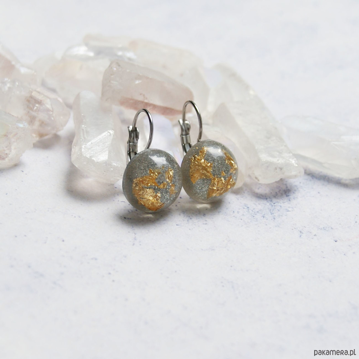 proste, ale bardzo efektowne kolczyki wykonane ze złotych płatków zatopionych w żywicy.