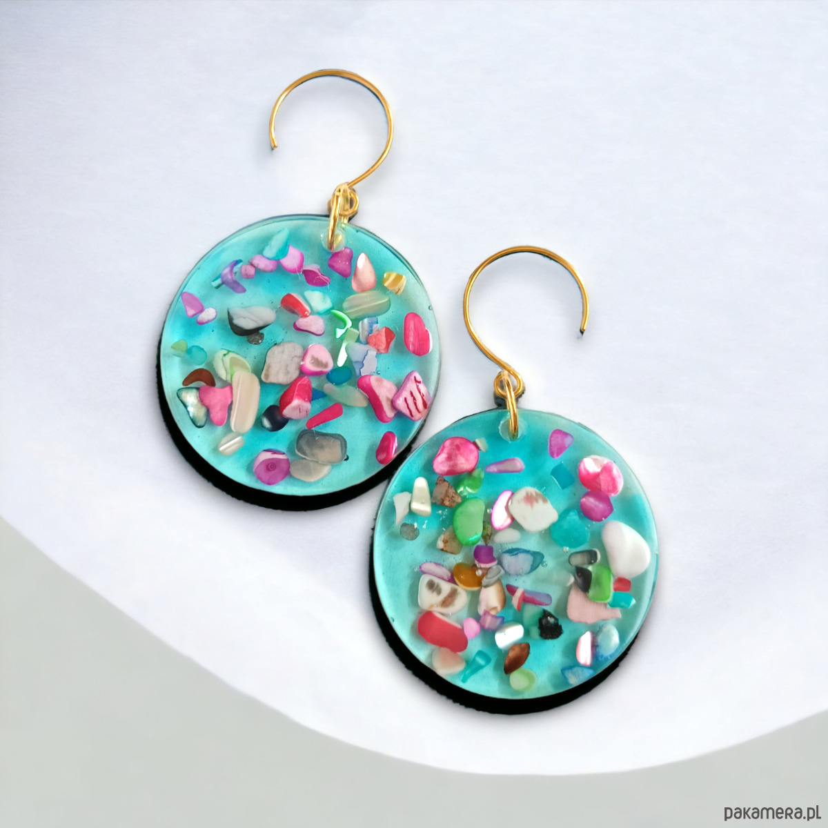 unikatowe kolczyki wykonane z transparentnej żywicy w odcieniach jasnego turkusu oraz zatopionych w niej nieregularnych cząstek wielobarwnej masy perłowej. kolorowe elementy wyglądają, jakby unosiły się na powierzchni wody.