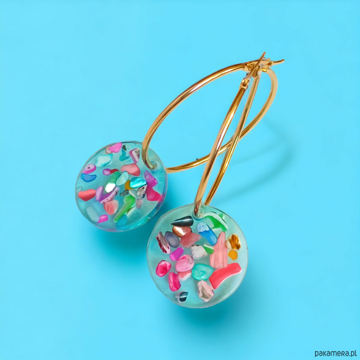 unikatowe kolczyki wykonane z transparentnej żywicy w odcieniach jasnego turkusu oraz zatopionych w niej nieregularnych cząstek wielobarwnej masy perłowej. kolorowe elementy wyglądają, jakby unosiły się na powierzchni wody.