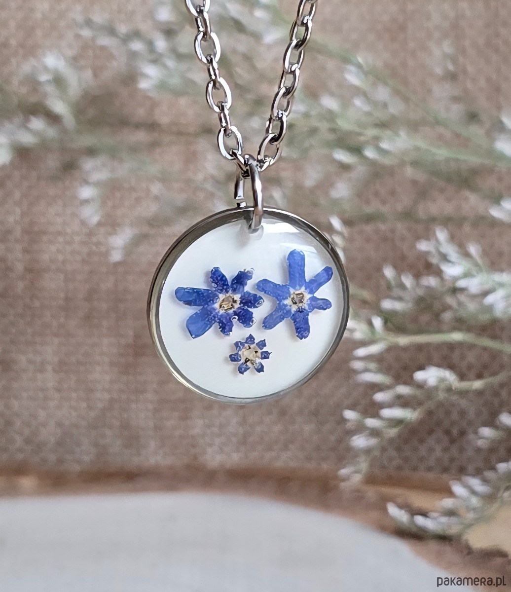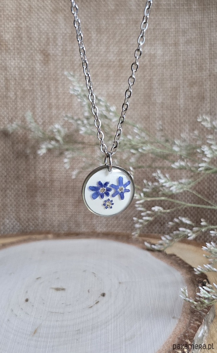 Oferuję Państwu unikalną biżuterię. Zawieszka jest wykonana z suszonych kwiatów i żywicy epoksydowej. Biżuteria jest wspaniałym i oryginalnym prezentem na lata.