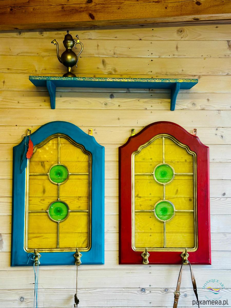dwa wieszaki ścienne wykonane ze starych drzwiczek meblowych (47 cm x 73 cm)