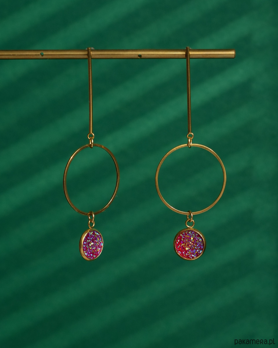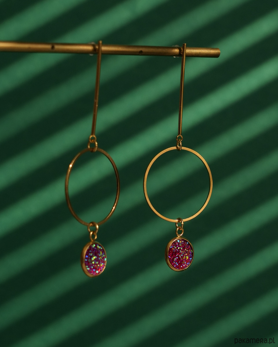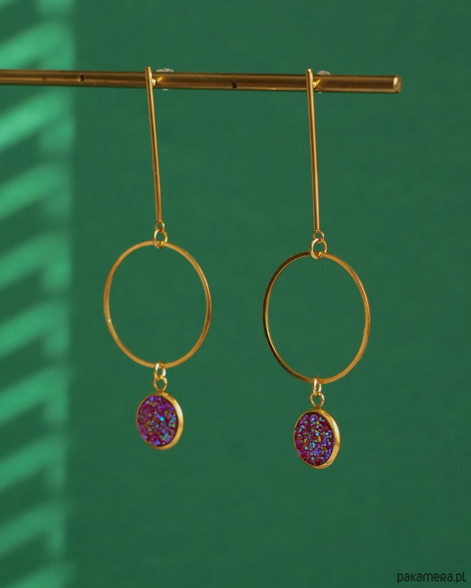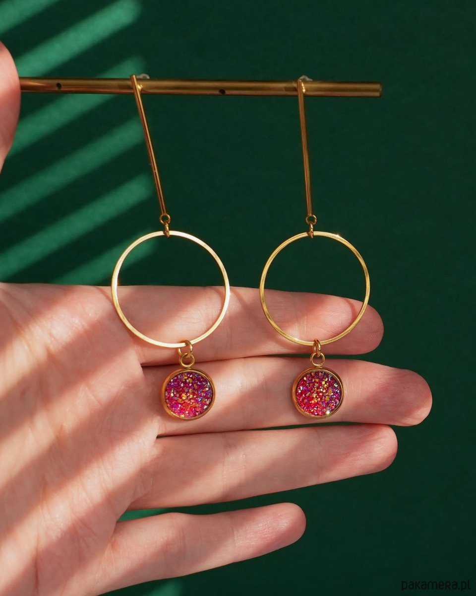 Oryginalne i unikatowe, długie, złote kolczyki z różowymi zawieszkami z brokatowym wykończeniem, zawieszone na ozdobnych, bardzo długich sztyftach. Zawieszki pięknie się mienią i przypominają słodkie żelki albo galaretki. Kolczyki na pewno będą przykuwać wzrok. Do noszenia na co dzień i na imprezę.