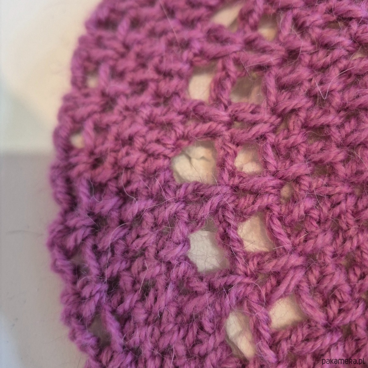 włóczki w kolorze lila-róż. Włóczka niezwykle szlachetna, miękka. Wzór ażurowy.Miękka , plastyczna forma dobrze układająca się na głowie. Beret bardzo delikatny.Ozfoba jesienno-zomowej a także wiosennej stylizacji.