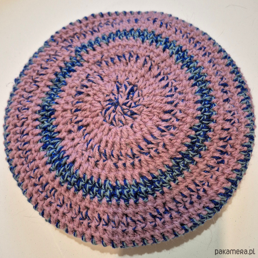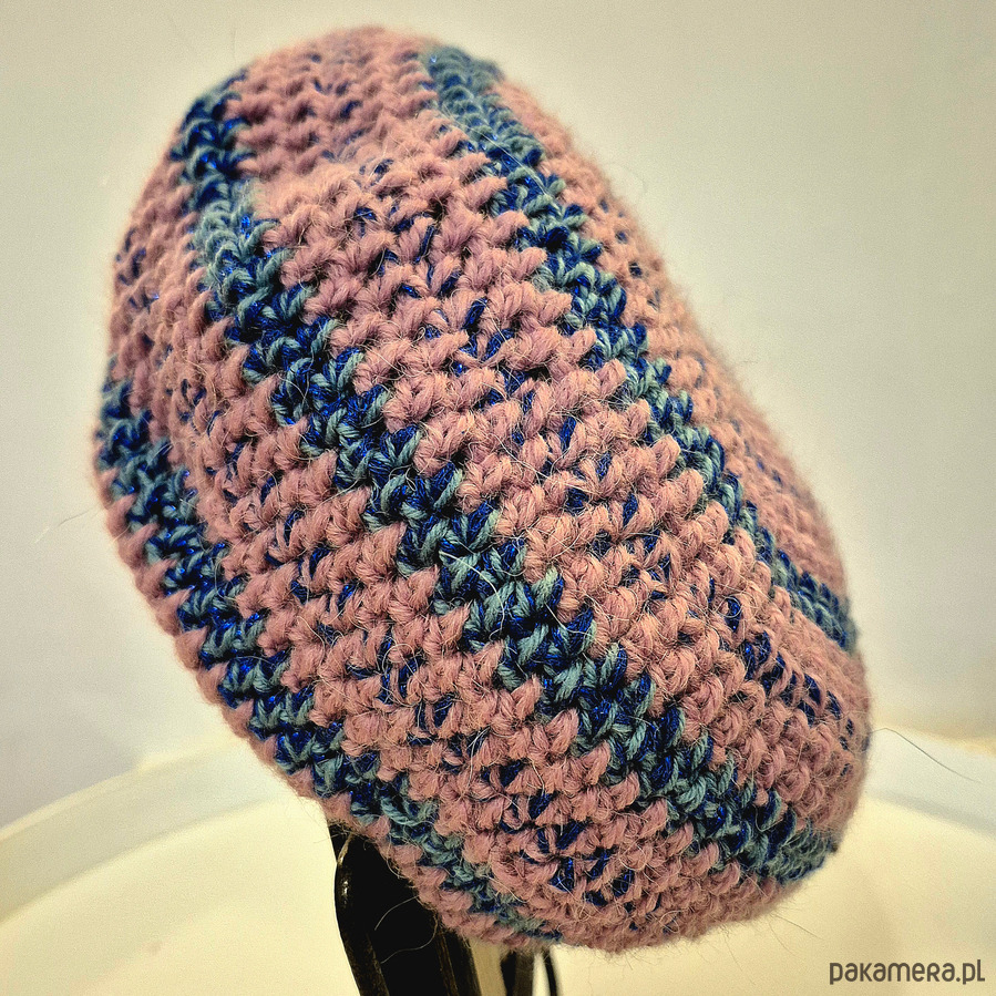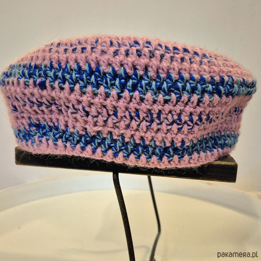 Unikatowy beret typu toczek, ręcznie zrobiony na szydełku ze szlachetnej włóczki w różowo- niebieskie prążki.Miękka , plastyczna forma dobrze układająca się na głowie.