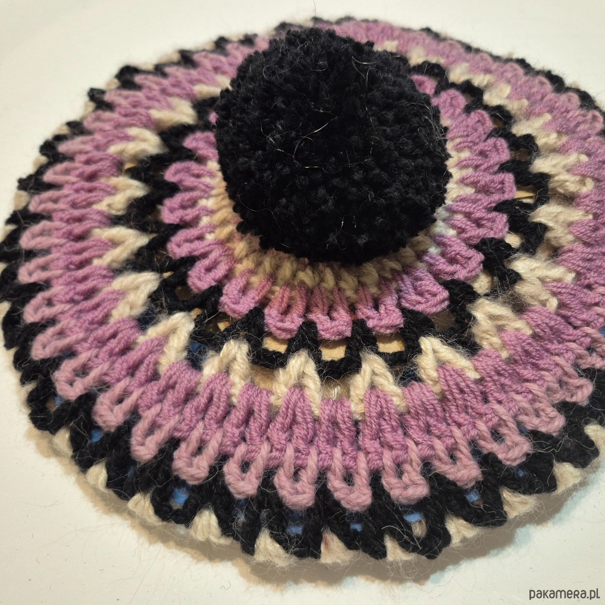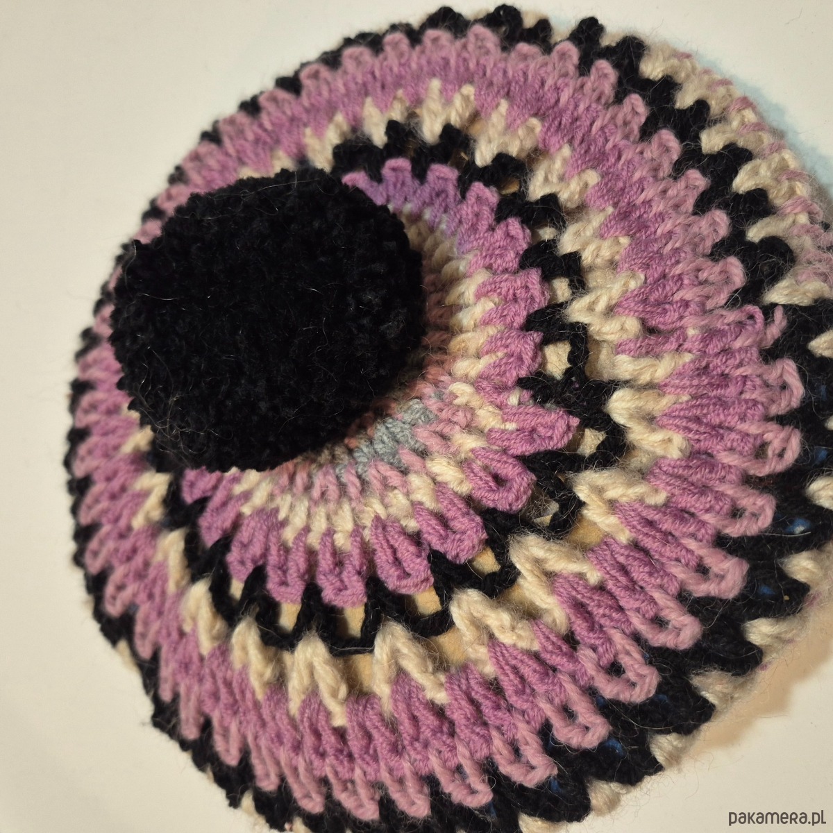 Unikatowy beret z pomponem, ręcznie zrobiony na szydełku z pięknych włóczek w różnych kolorach.Wzór ażurowy skladajacy się z różnej wielkości oczek.Miękka , plastyczna forma dobrze układająca się na głowie. Beret casualowy, który można także połączyć z ubraniami eleganckimi. Ciekawy i oryginalny element stylizacyjny.⁹