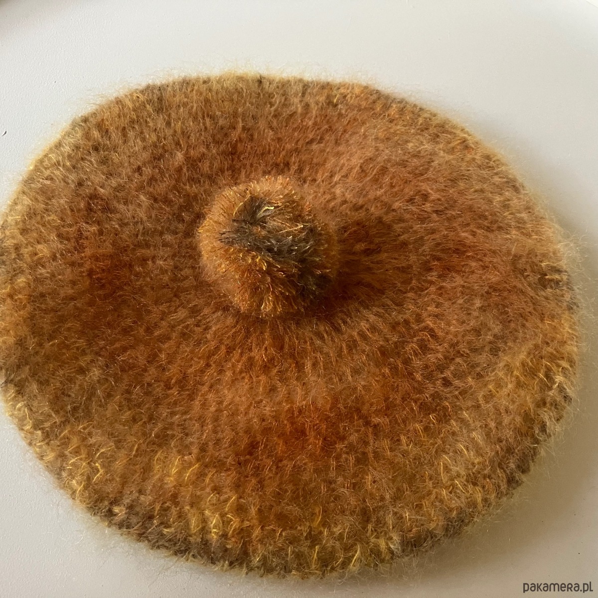 Unikatowy beret z cieniowanej włóczki moherowej.