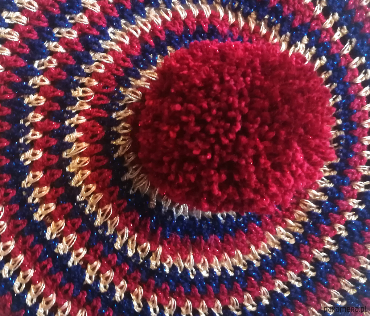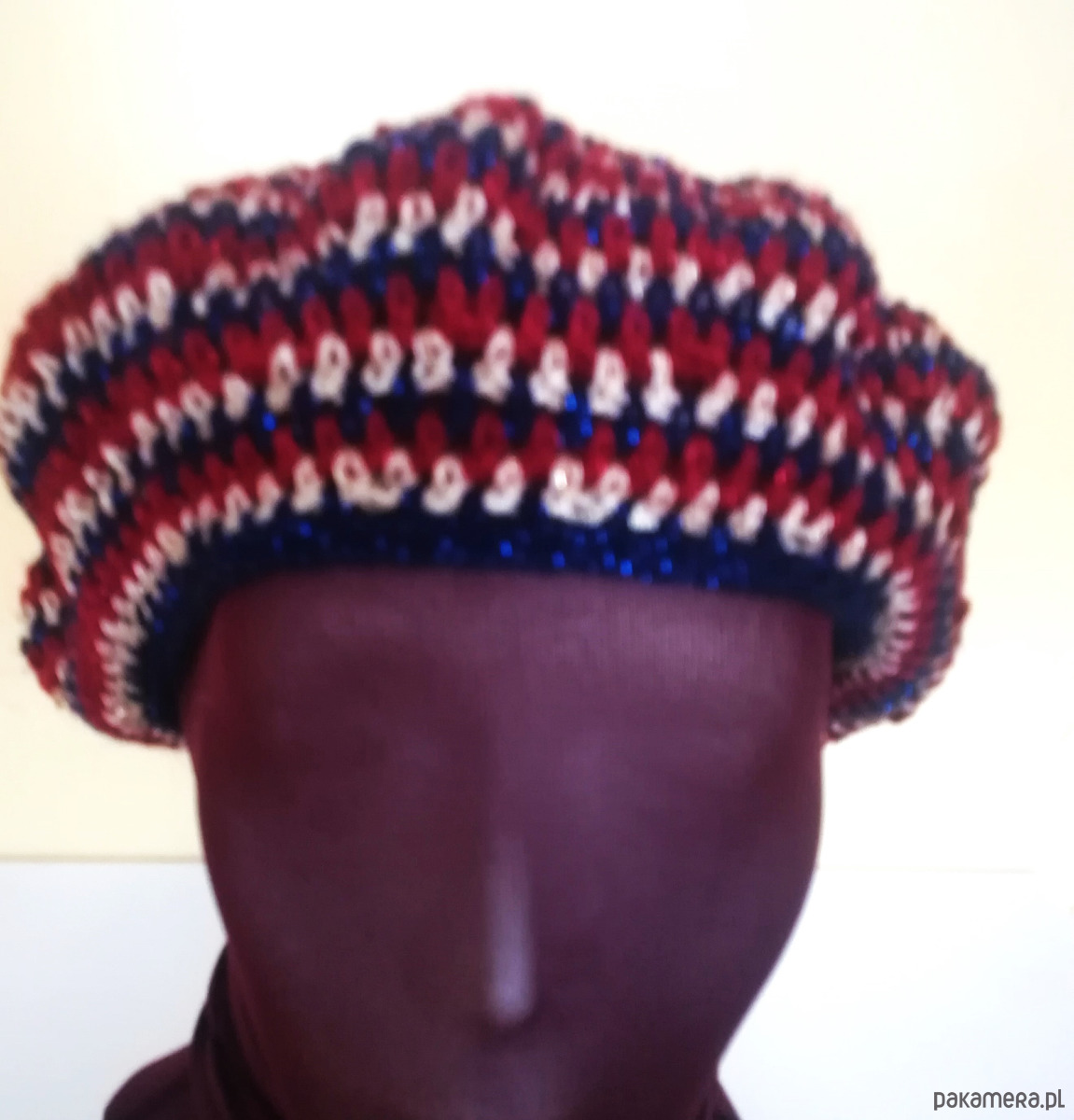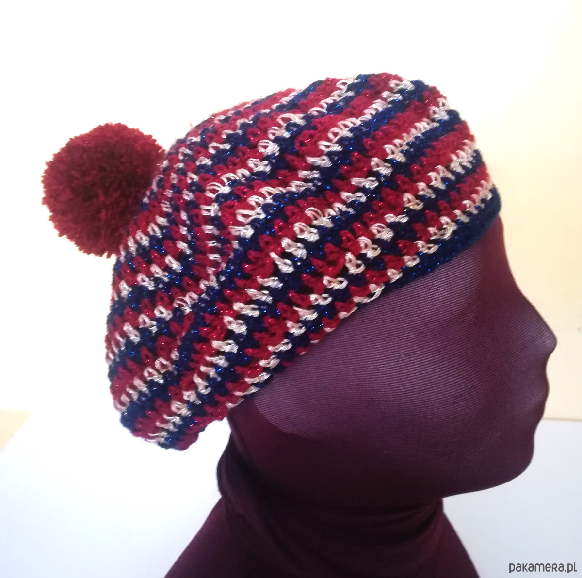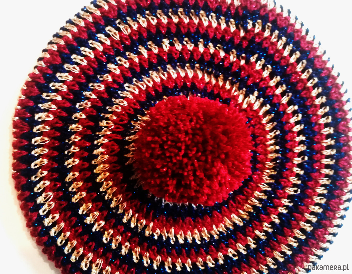 Ręcznie zrobiony na szydełku beret w kolorowe prążki. Beret zrobiony z włóczek z błyszczącą nitką w kolorystyce granatu, bordo i złota . Ozdobiony pomponem. Beret zrobiony luźnym wzorem, miękki, delikatny, plastycznie układający się na głowie.