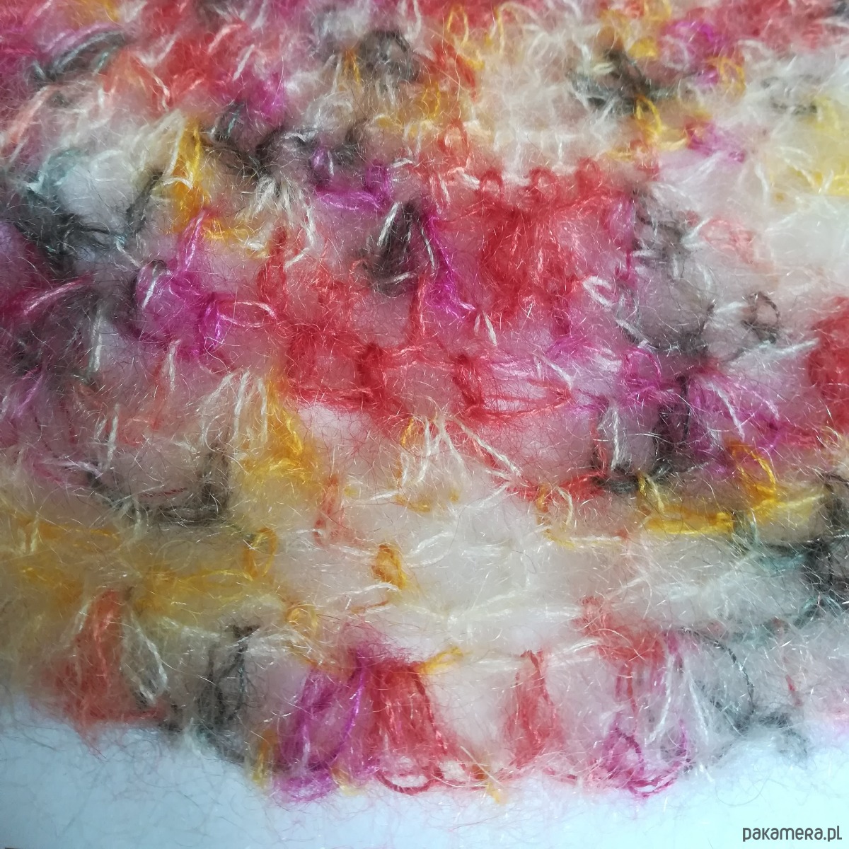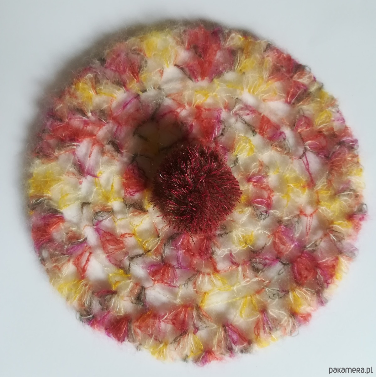 Unikatowy beret z wielobarwnej włóczki moherowej.