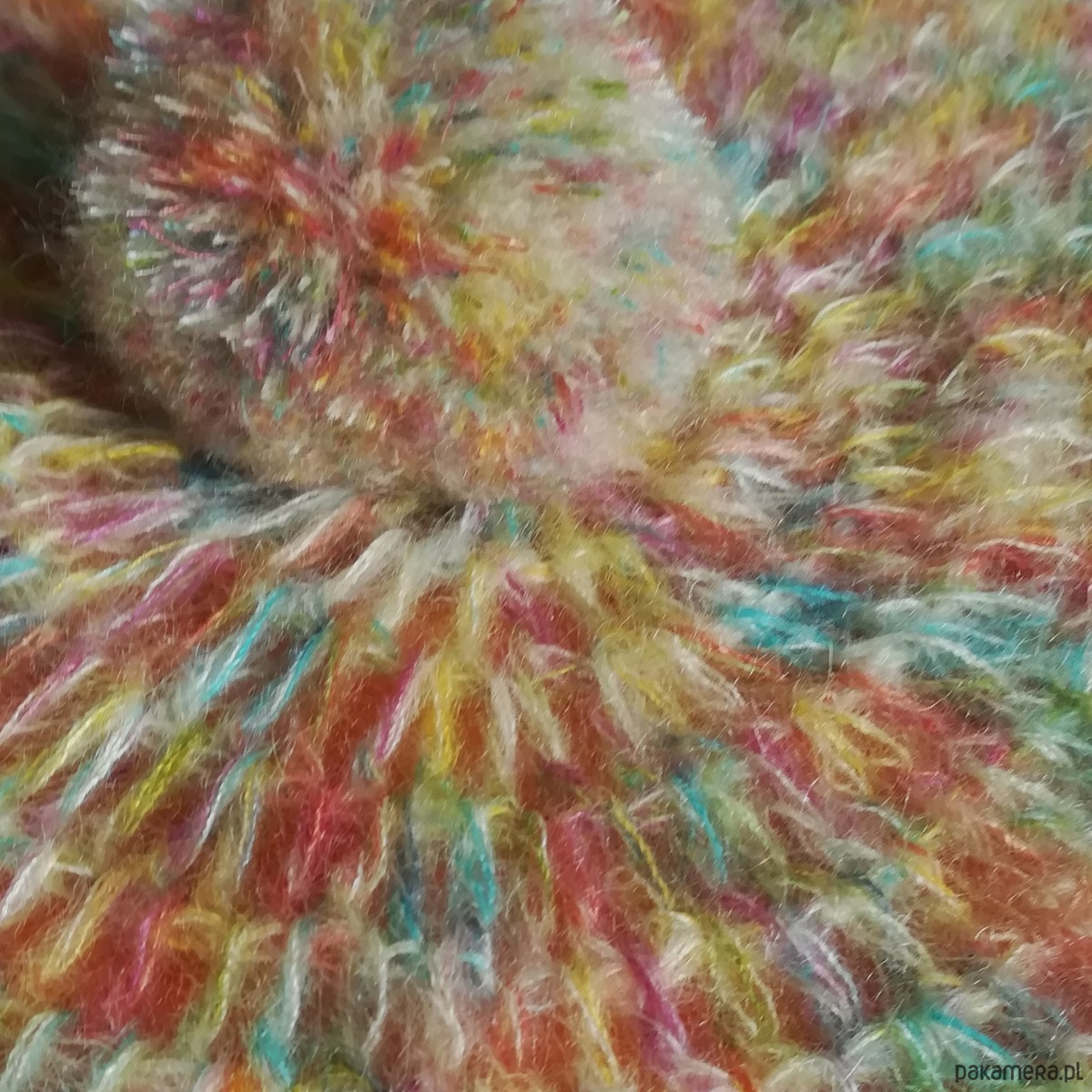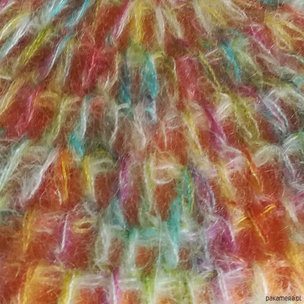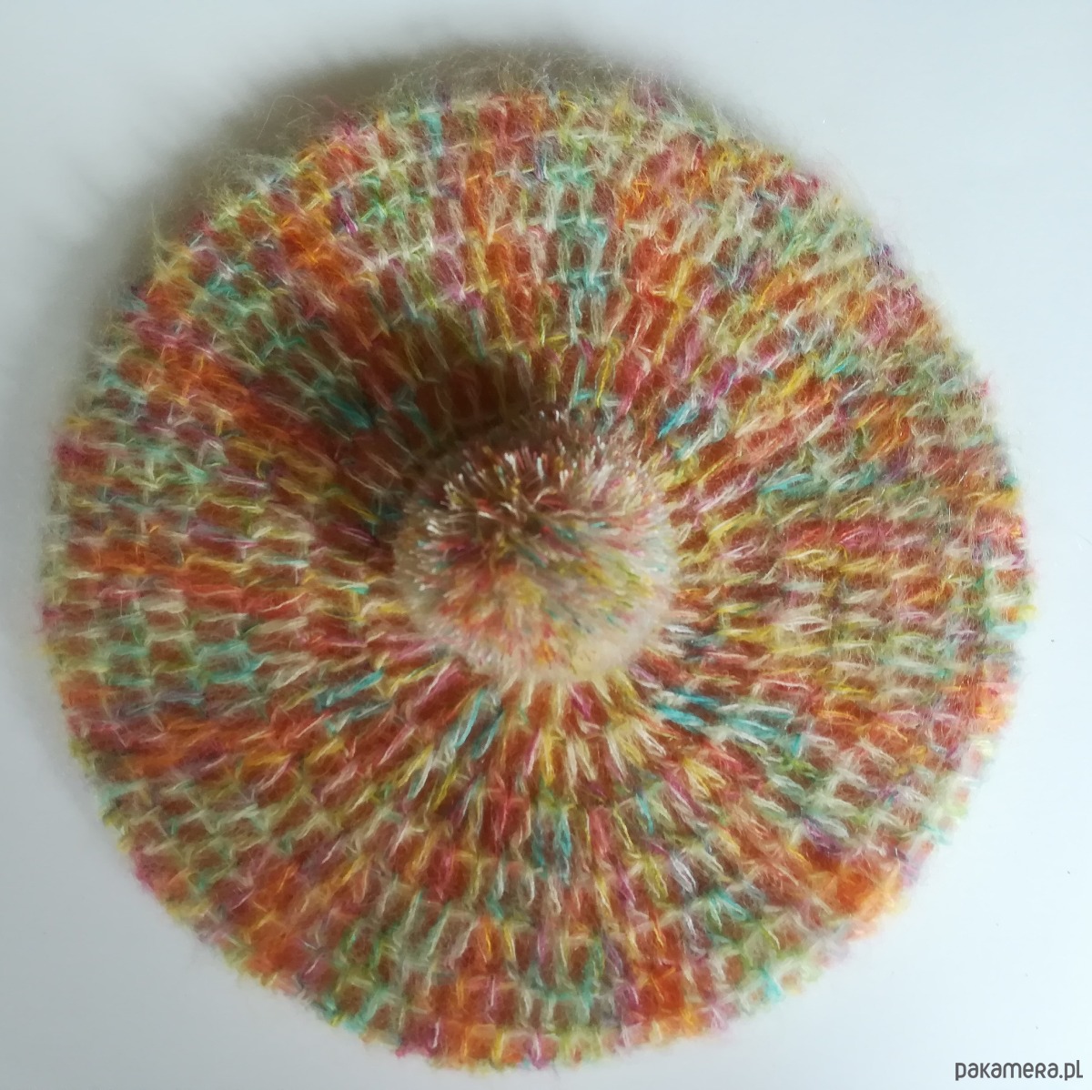 Unikatowy beret z wielobarwnej włóczki moherowej.