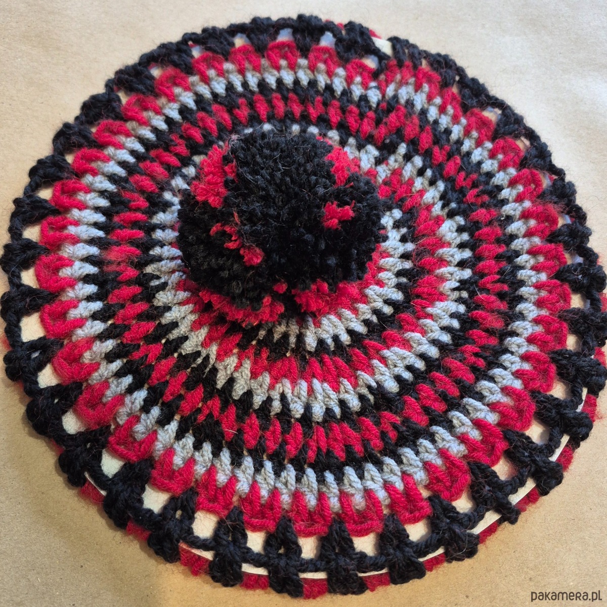 Unikatowy beret z pomponem, ręcznie zrobiony na szydełku z pięknychł włóczek w różnych kolorach.Wzór ażurowy skladajacy się z różnej wielkości oczek.Miękka , plastyczna forma dobrze układająca się na głowie. Beret casualowy, który można także połączyć z ubraniami eleganckimi. Ciekawy i oryginalny element
