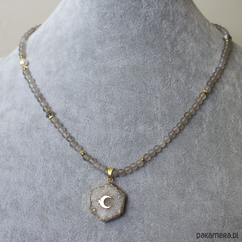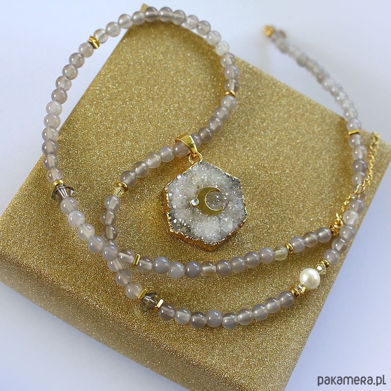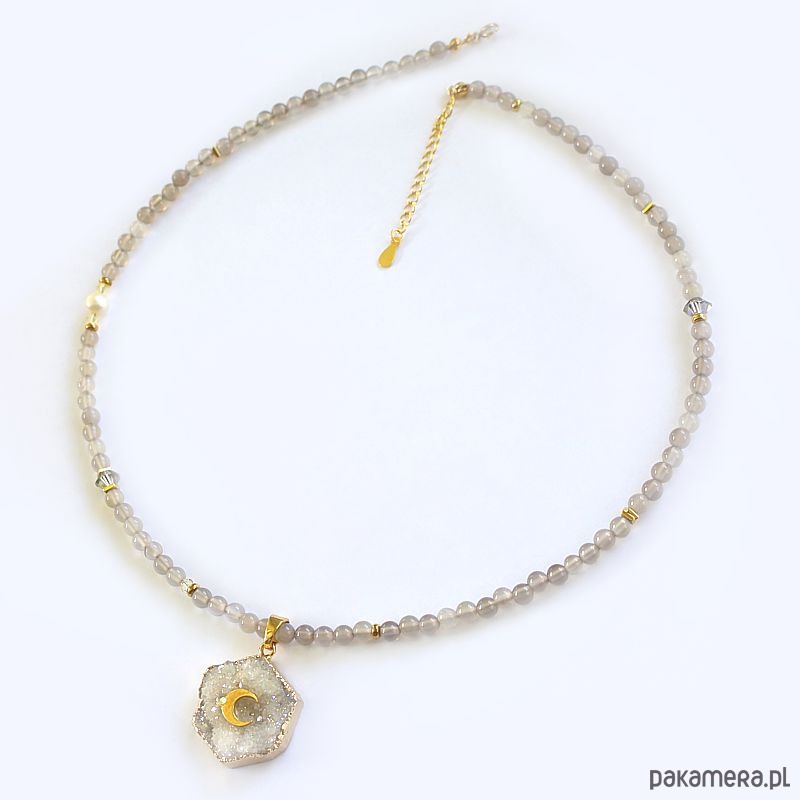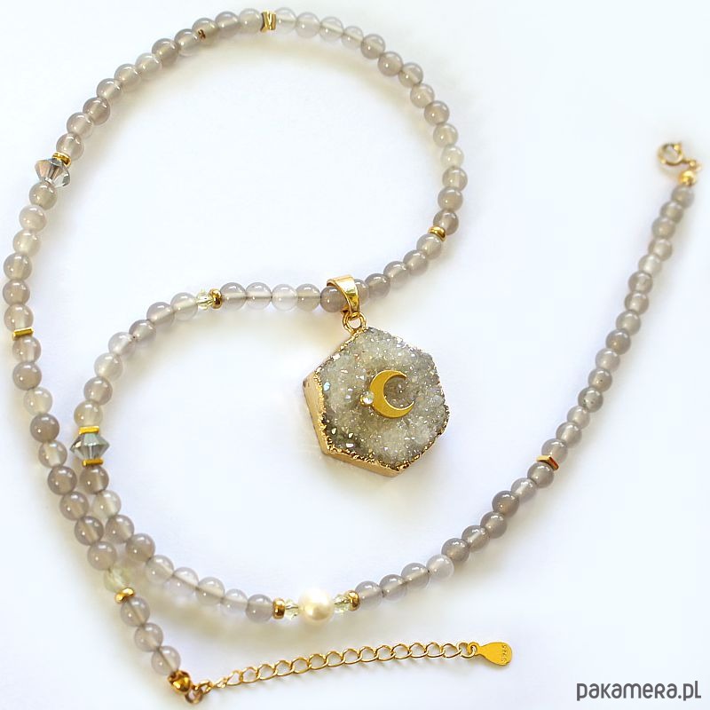 Autorski energetyczny naszyjnik z agatów szarych, z przepiękną druzą agatu z księżycem ze srebra 925 pozłacanym 24k złotem.