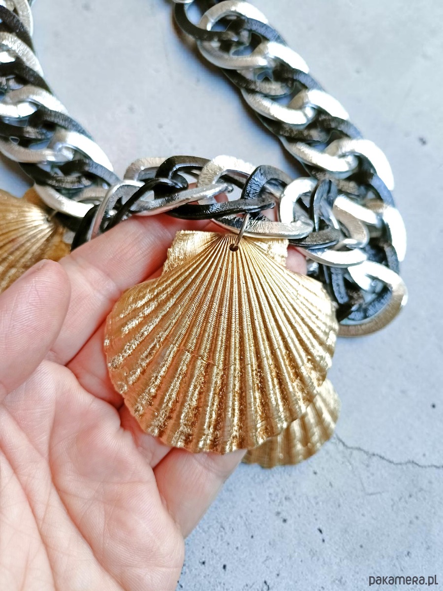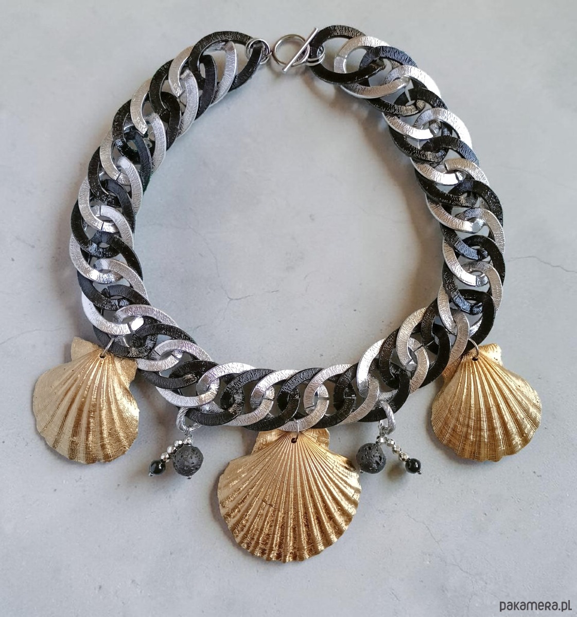 Muszle zawieszone na czarno-srebrnym metalowym łańcuchu o niezwykle masywnych oczkach
