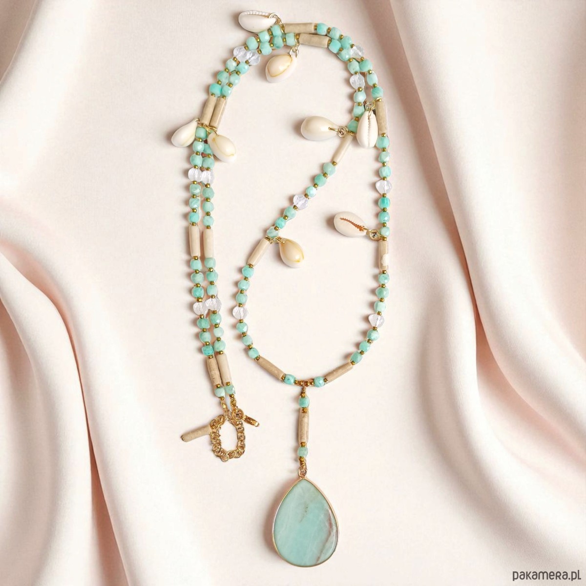 UNIKATOWY długi naszyjnik: pastelle summer: amazonit, muszle