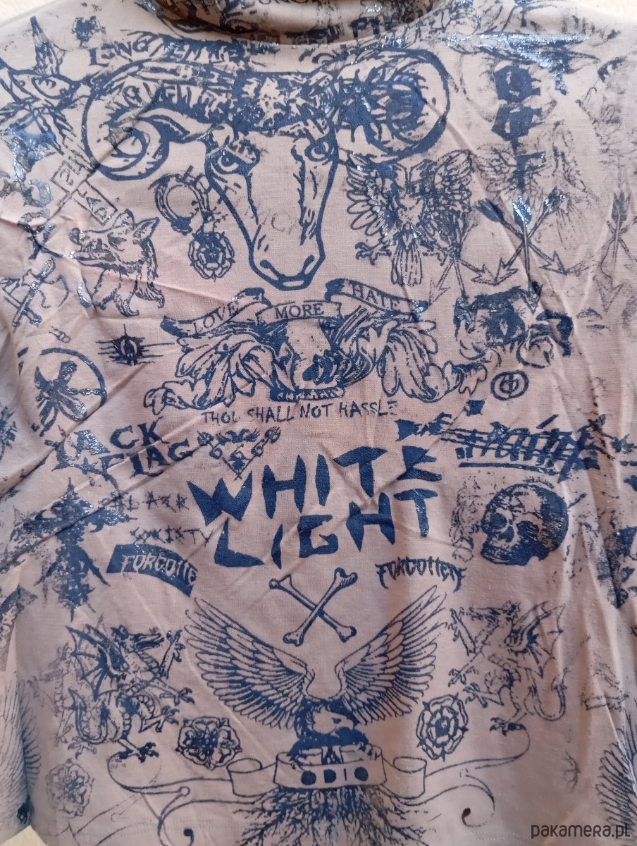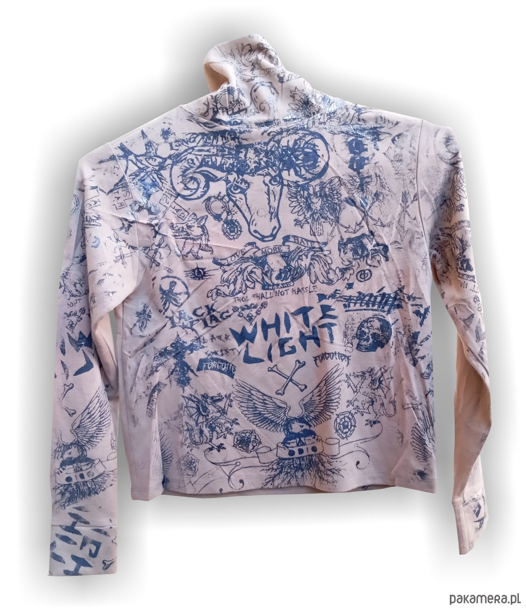 Model jest całkowicie unikatowy – posiada autorski nadruk z detalami wykonanymi techniką miejscowego błysku folii, co dodaje ubraniu niepowtarzalnego charakteru.