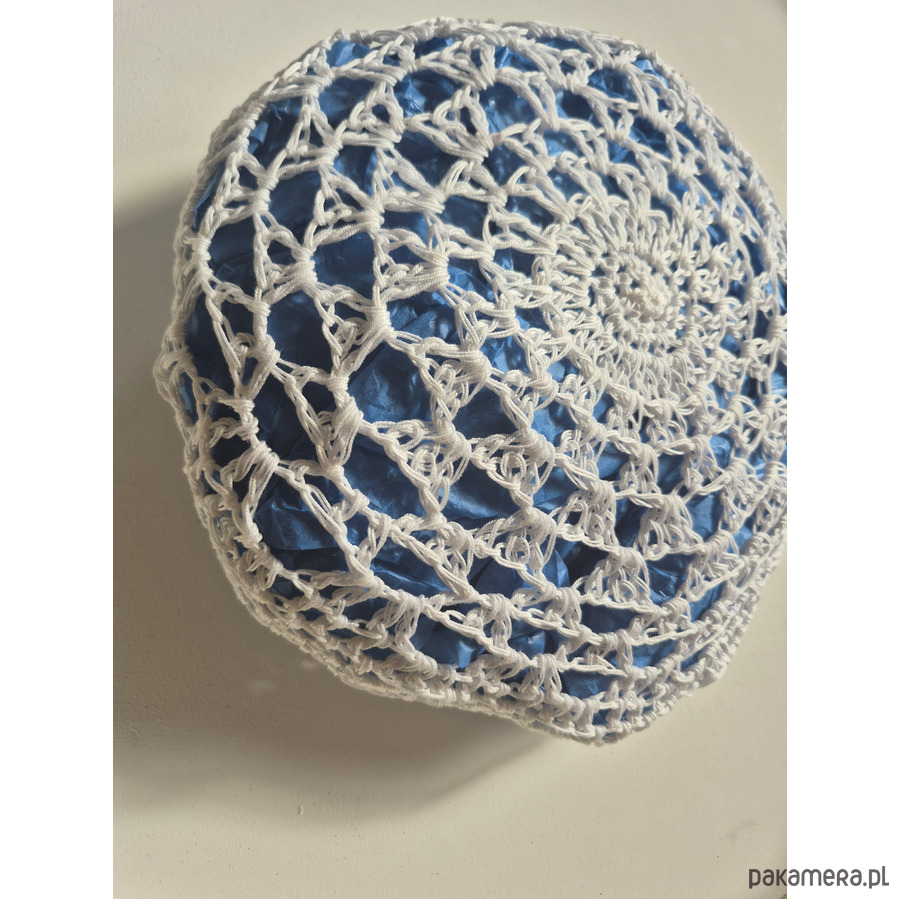 Unikatowy, letni beret zrobiony ręcznie na szydełku z białej włóczki bawełnianej.Miękka, plastyczna forma dobrze układająca się na głowie. Dzięki luźnej strukturze ażurowych oczek bardo przewiewny. Bardzo dekoracyjny. Doskonały dodatek do letniej garderoby.