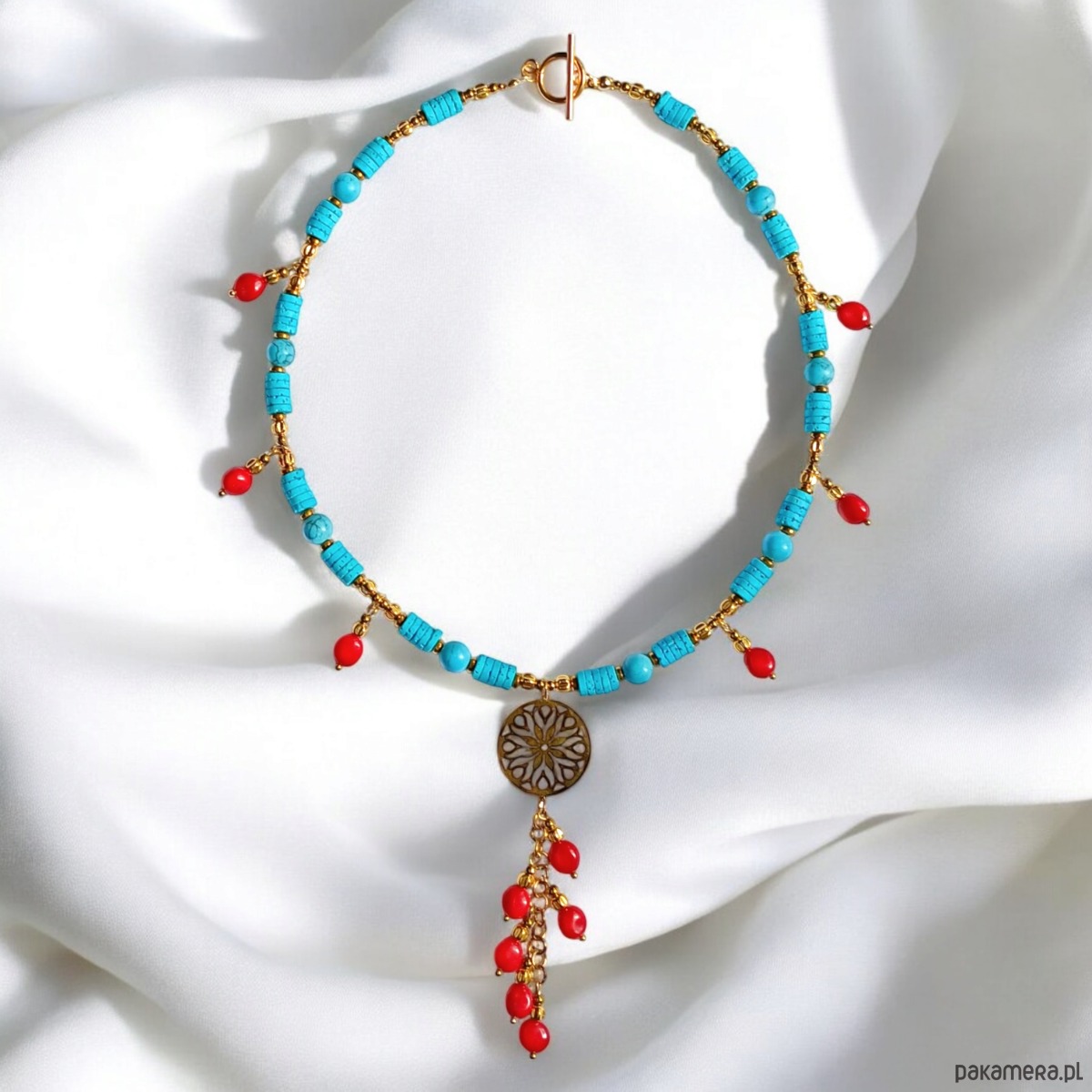 UNIKATOWY naszyjnik : INDIA : turkus, czerwień złoto