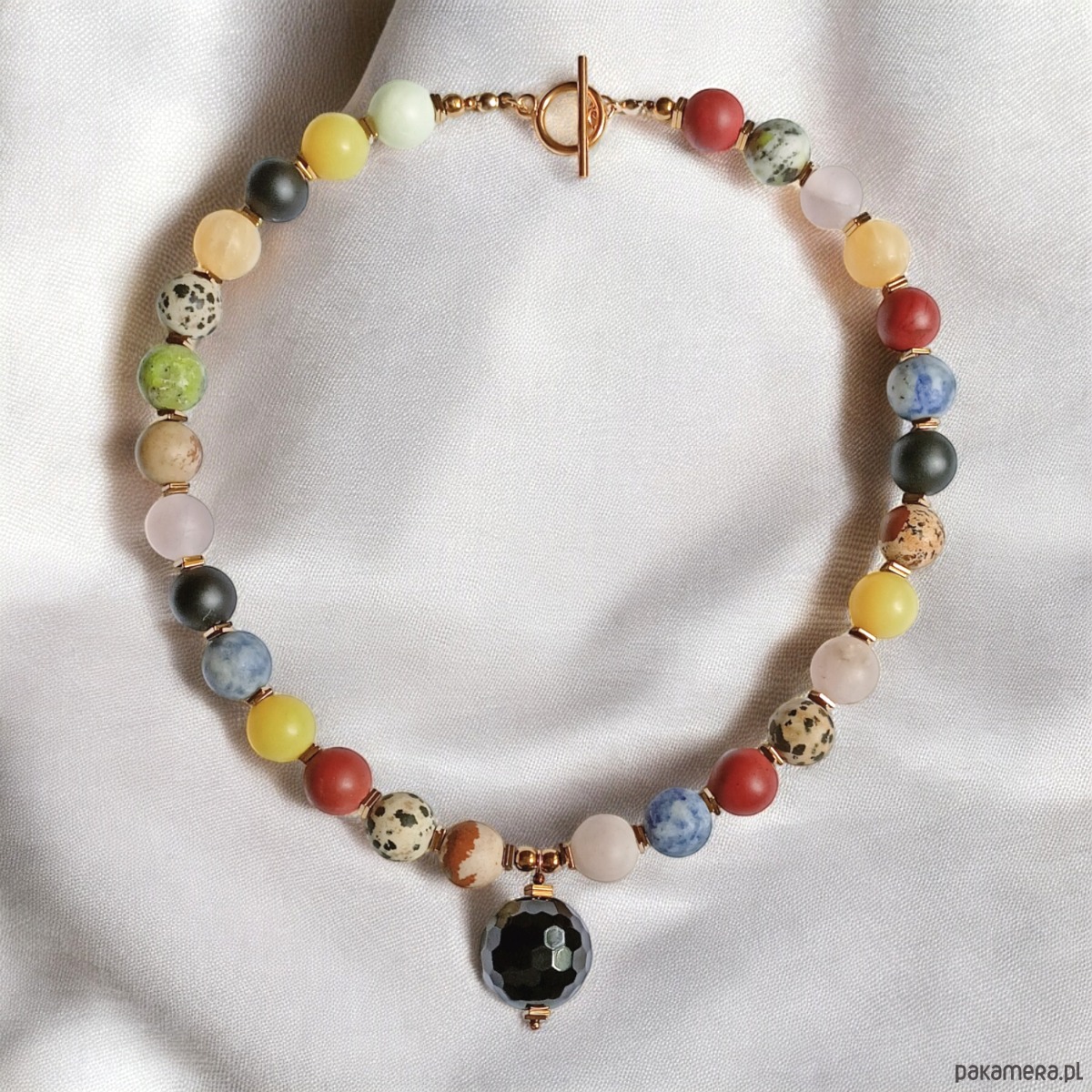 Naszyjnik wykonany z miksu kamieni (duże, matowe kule 12mm) oddzielonych od siebie kwadratowymi przekładkami że złotego hematytu.