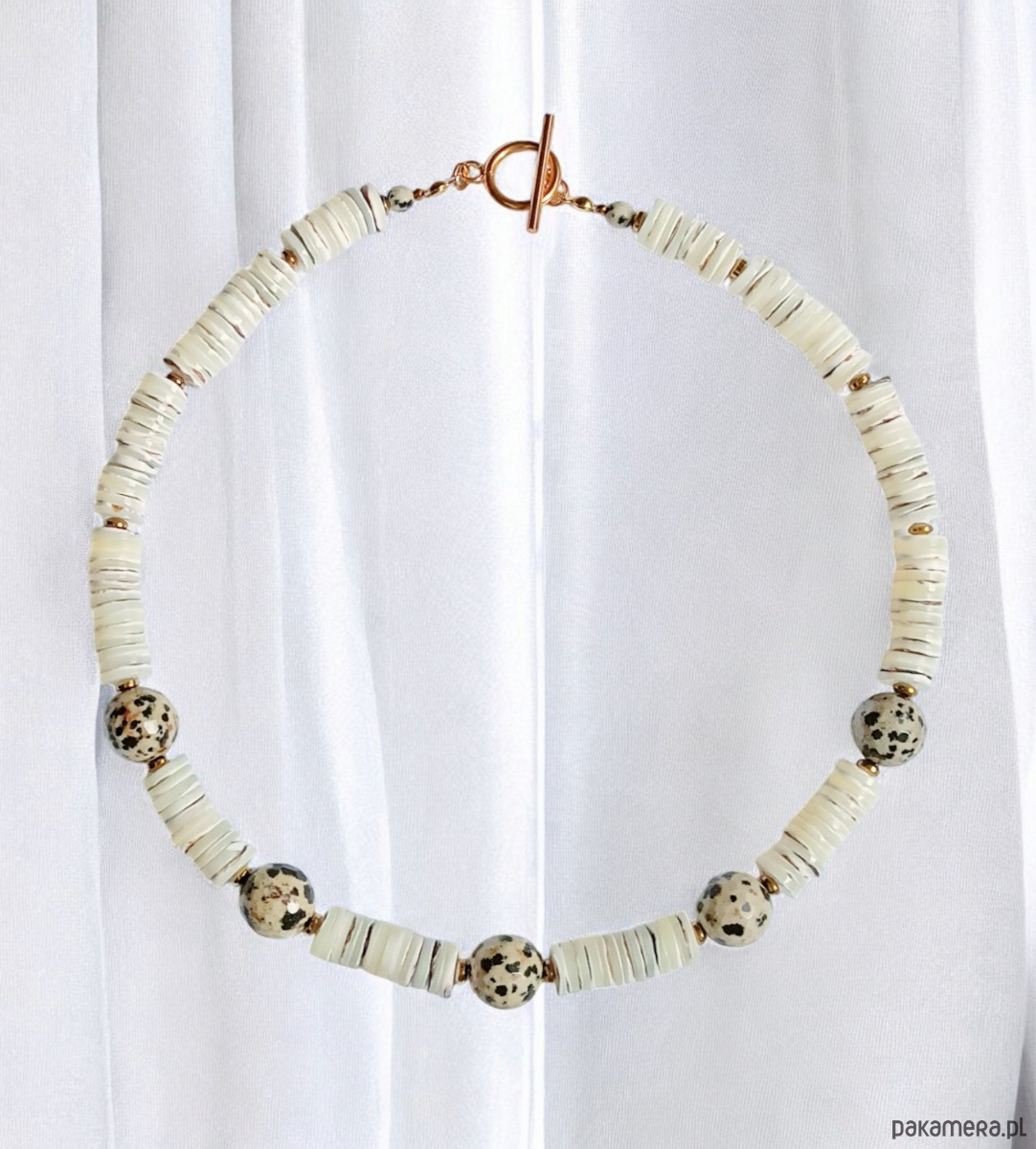 Naszyjnik wykonany z nieregularnych plastrów kremowej muszli oraz kul jaspisu dalmatyńskiego (duże, fasetowane kule 12mm) oddzielonych od siebie przekładkami ze złotego hematytu.