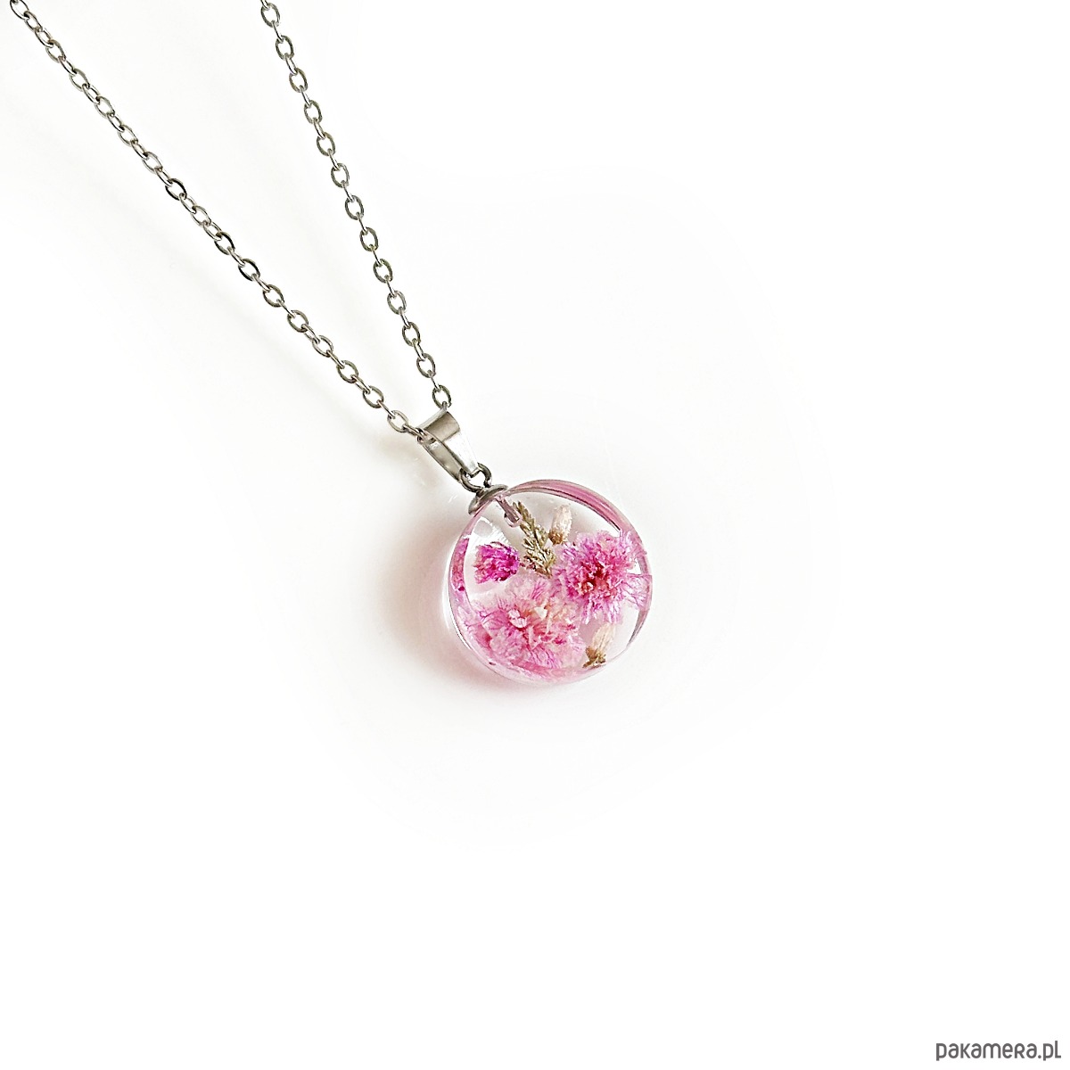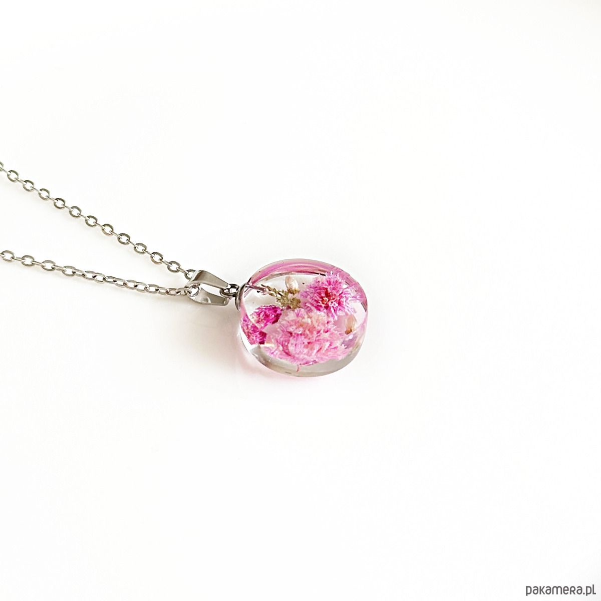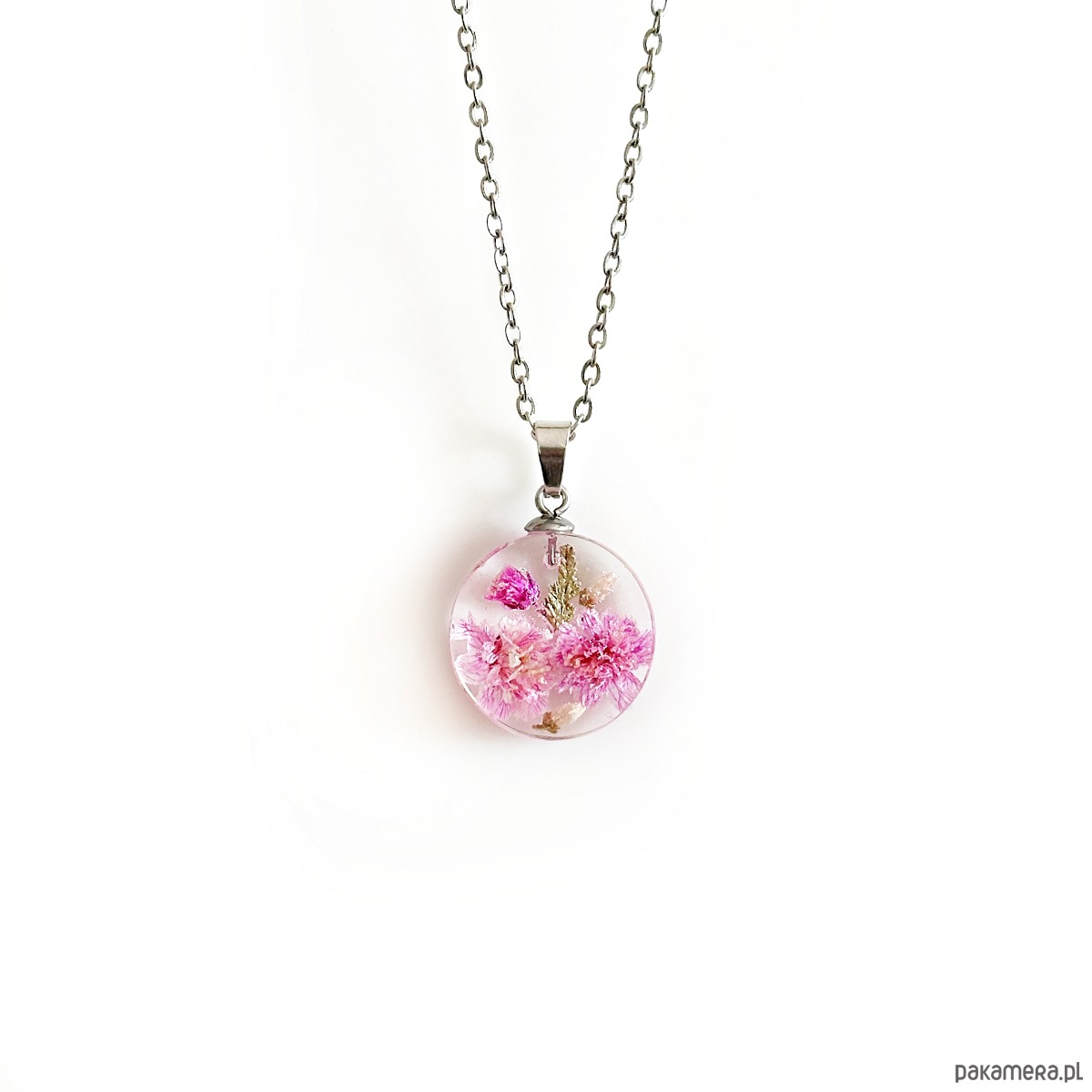 W naszyjniku zostały utrwalone kwiaty wrzosu oraz gipsówki.