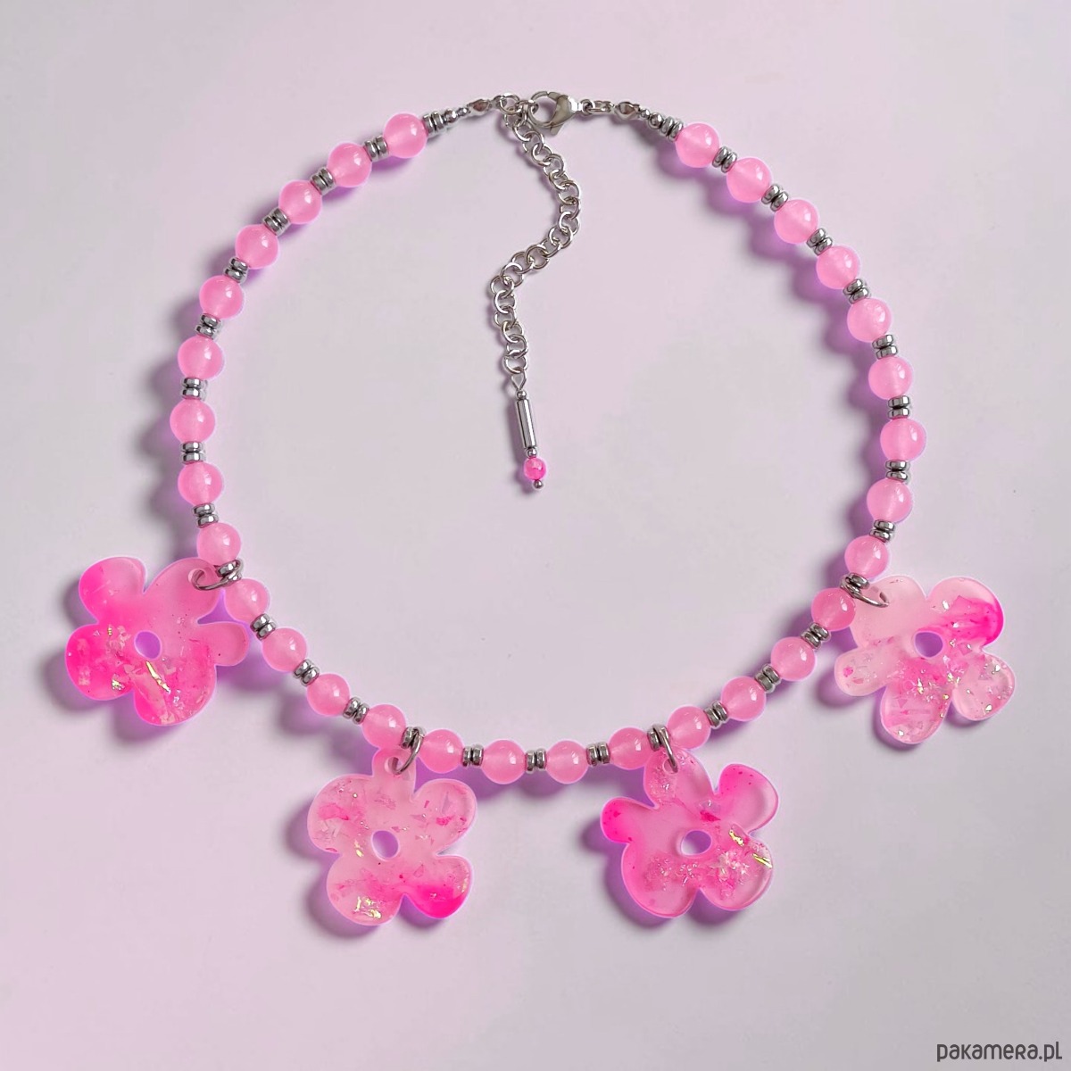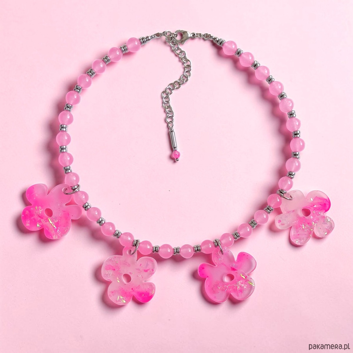 na solidnej lince stalowej (miękkiej) - został wykonany z różowego jadeitu (8mm), srebrnego hematytu oraz własnoręcznie wykonanych kwiatków z żywicy (odcienie różu + płatki holo)