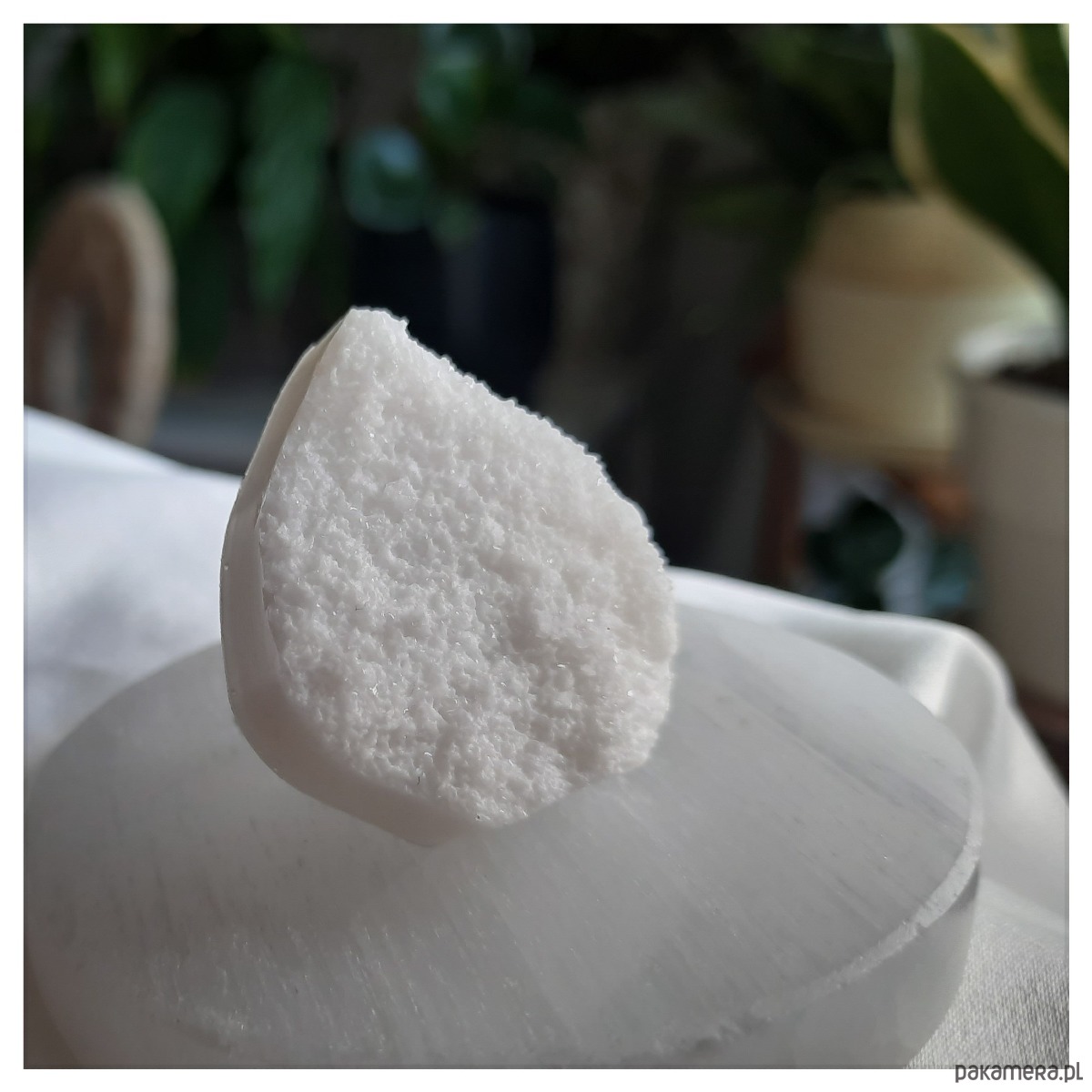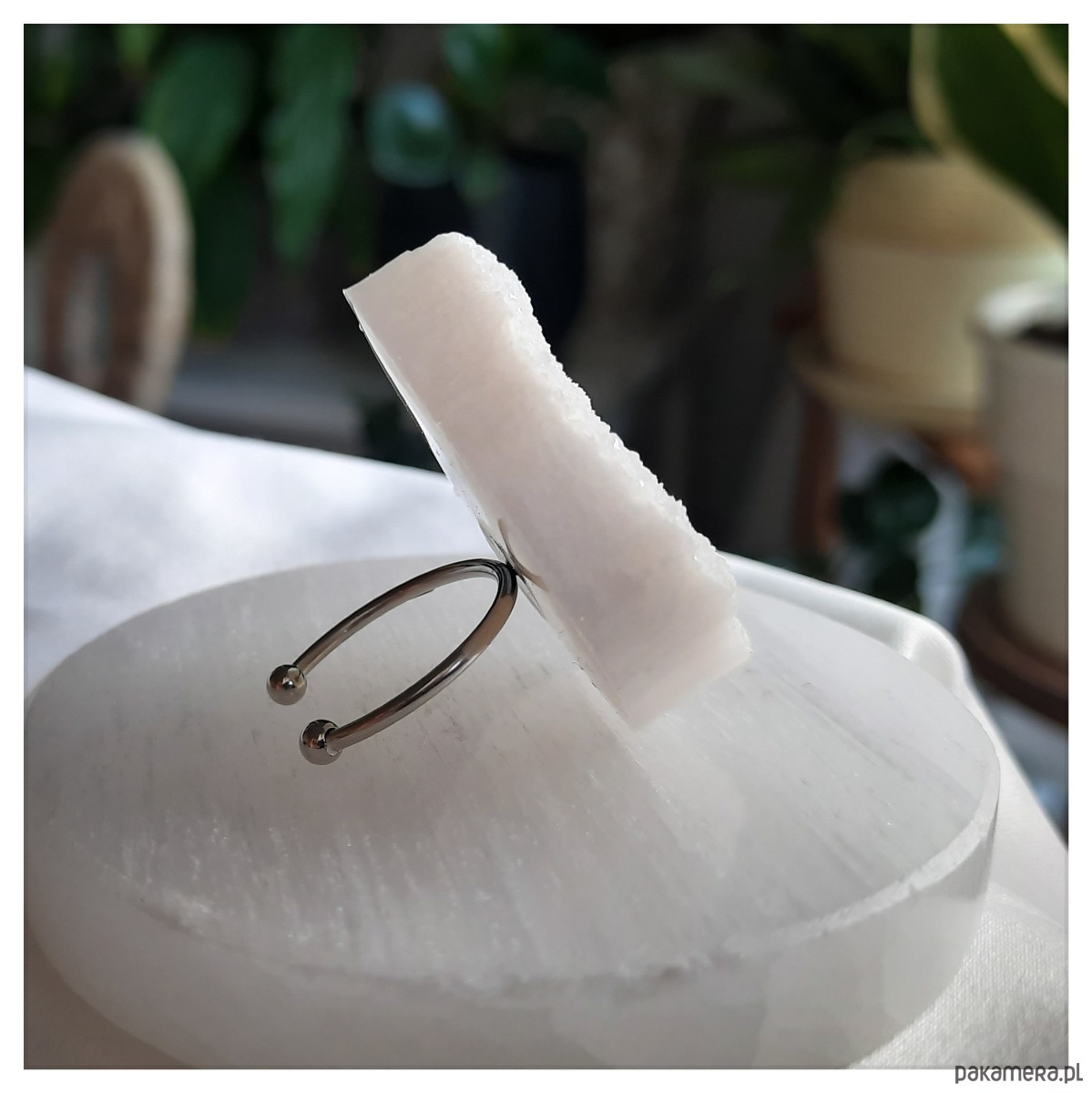 Duży unikatowy pierścionek z żywicy epoksydowej. Pierścień ma chrobotwą, matową powierzchnię.