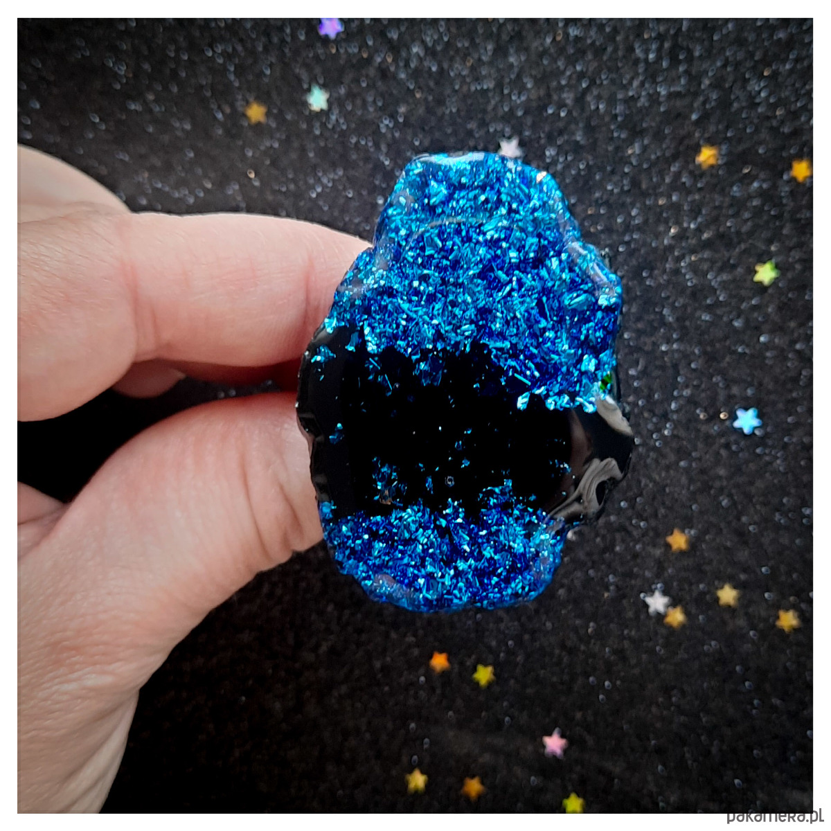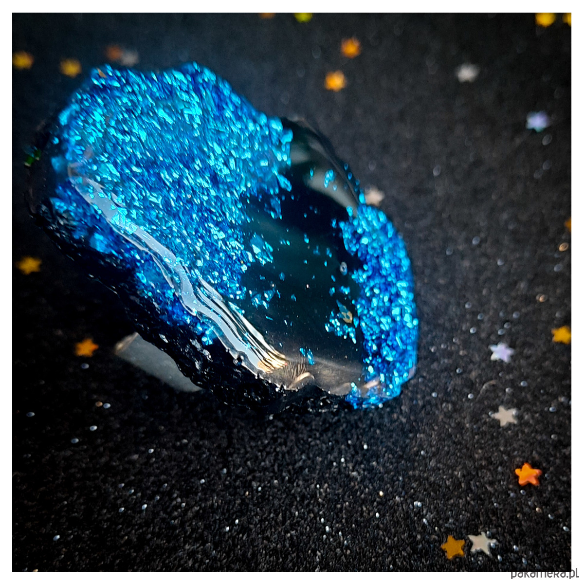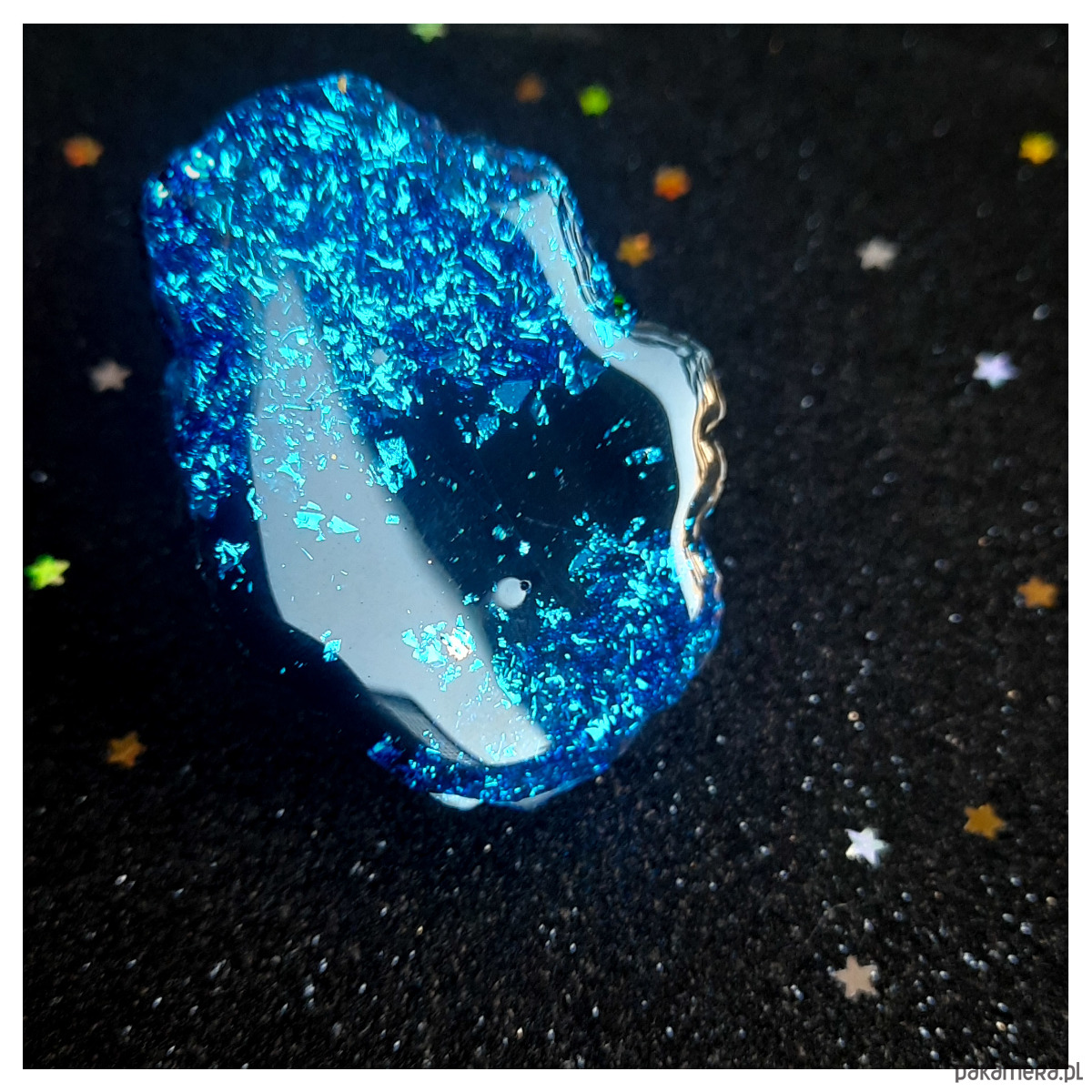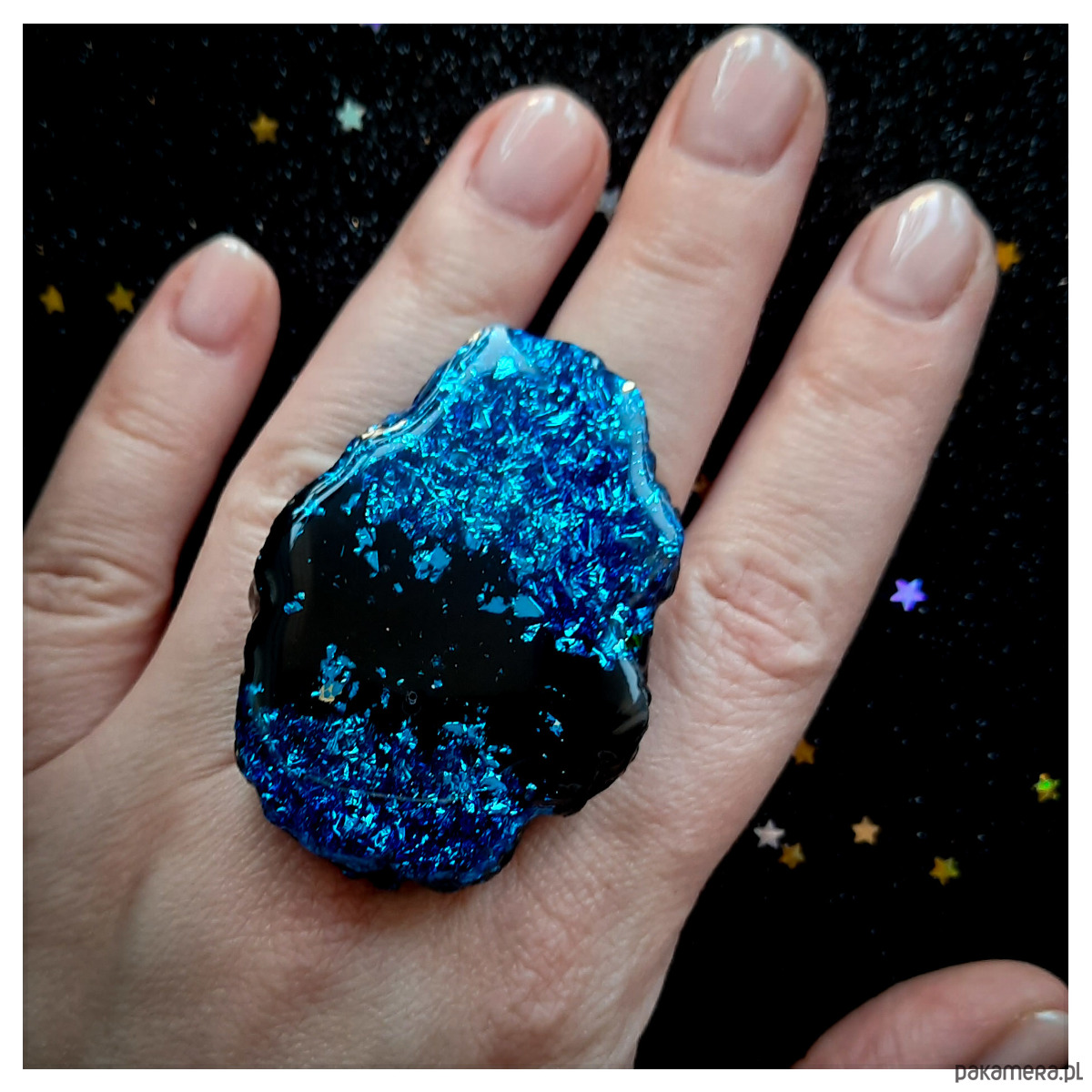 Duży pierścień z zatopionymi w żywicy epoksydowej drobinakmi w kolorze niebieskim.