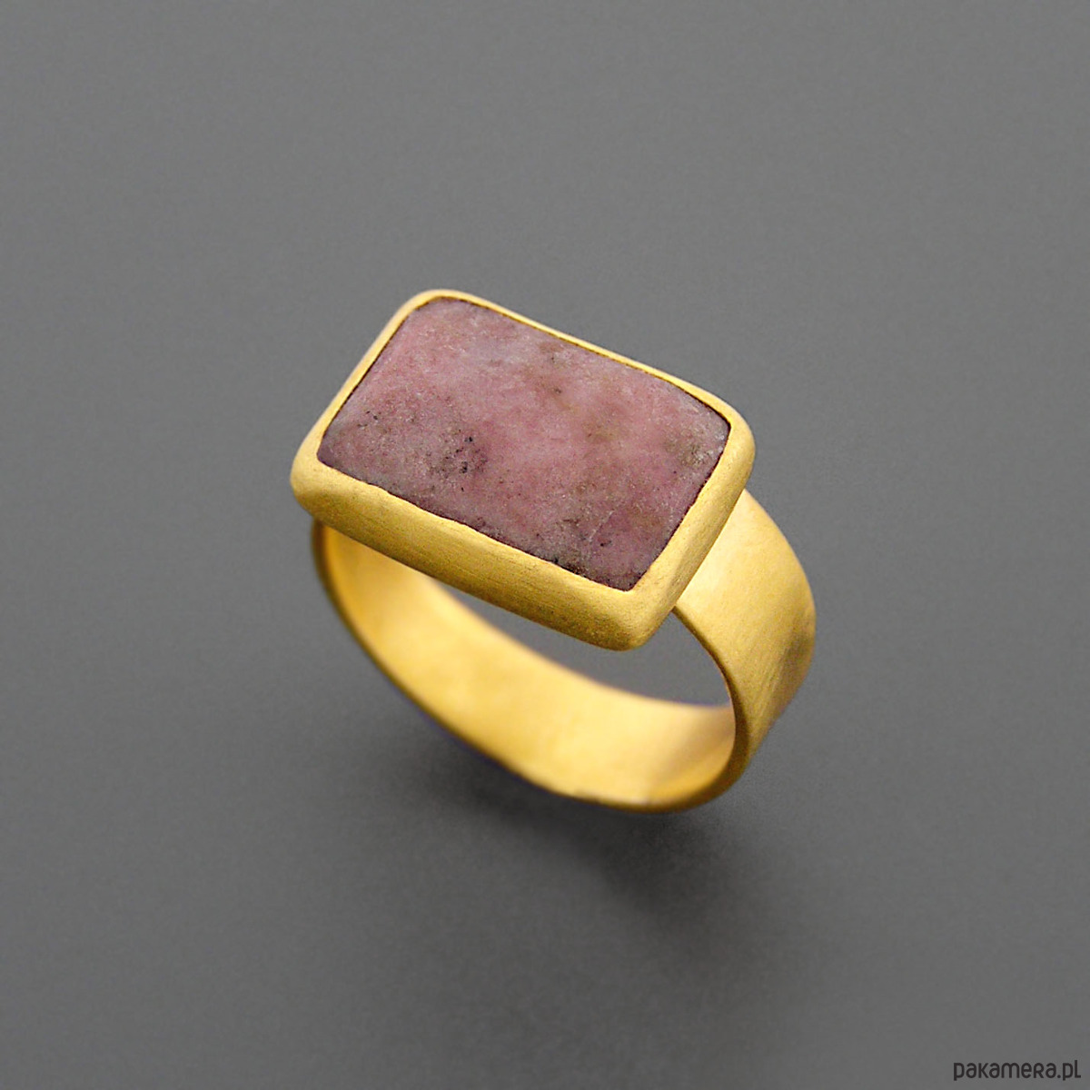Unikatowy pierścionek z rodonitem - wykonany z satynowanego srebra 925, złocony warstwą 2 mikronów 24 karatowego złota.