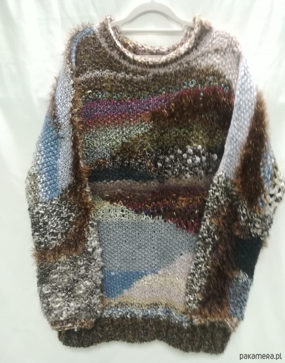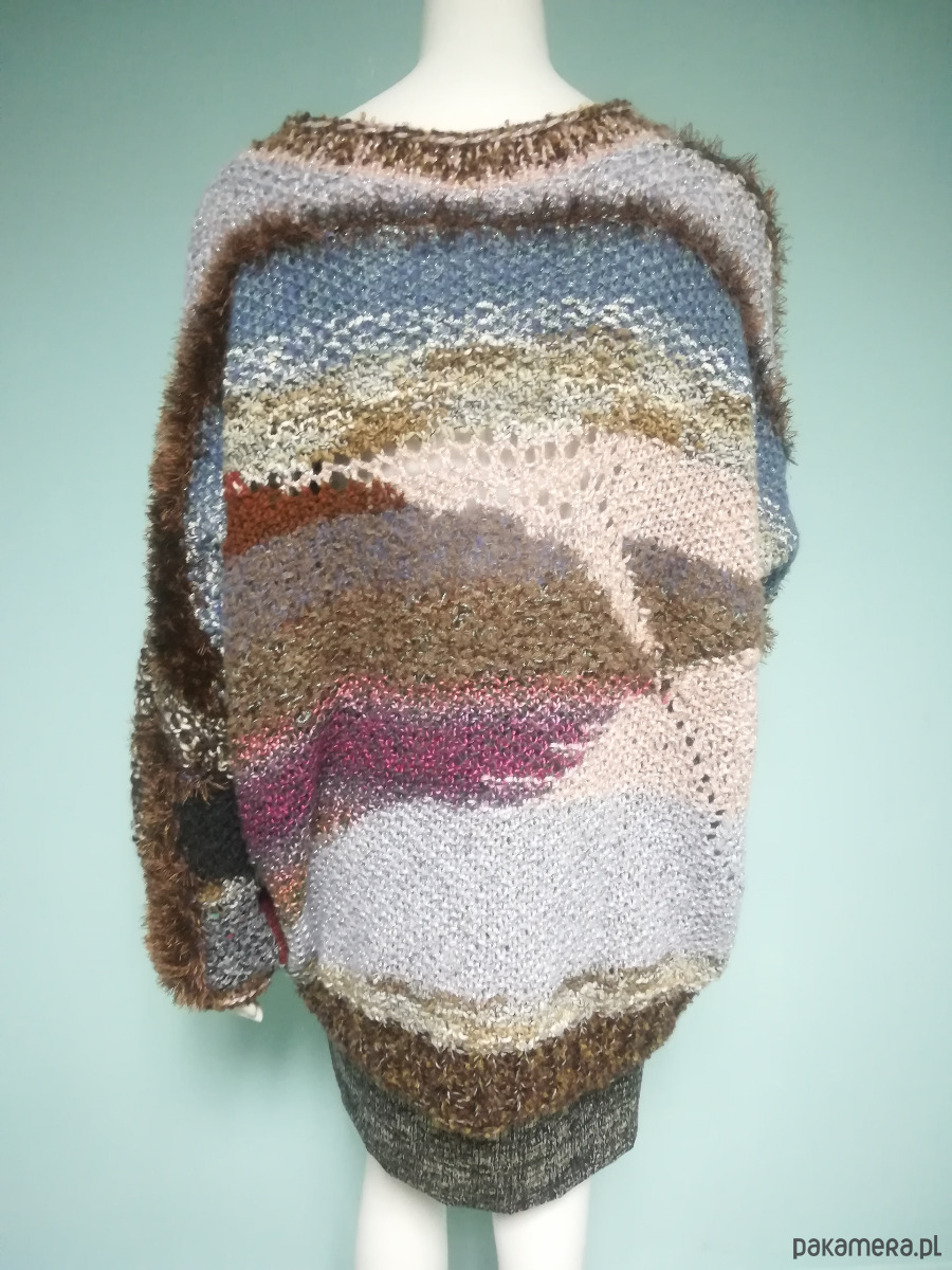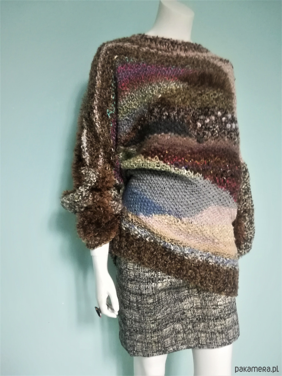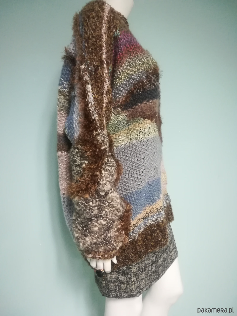 Unikatowy sweter zrobiony ręcznie na drutach ze szlachetnych włóczek, w pastelowych kolorach. Ścieg ryżowy. Prosta miękka,luźna,duża forma swetra. Faktura wzbogacona wypukłymi kulkami. Gdzie nie gdzie użyto włóczek ze złotą i srebrną nitką. Sweter stworzony do koordynacji z dżinsami lub innymi spodniami w stylu casual. Ponadczasowy, doskonały na prezent dla osób oryginalnych, ceniących ubrania niepowtarzalne i szlachetne. Styl boho.