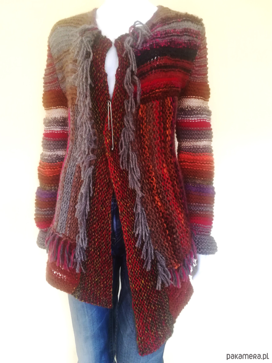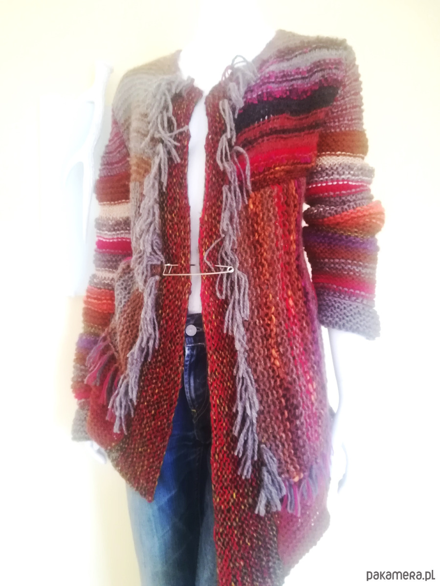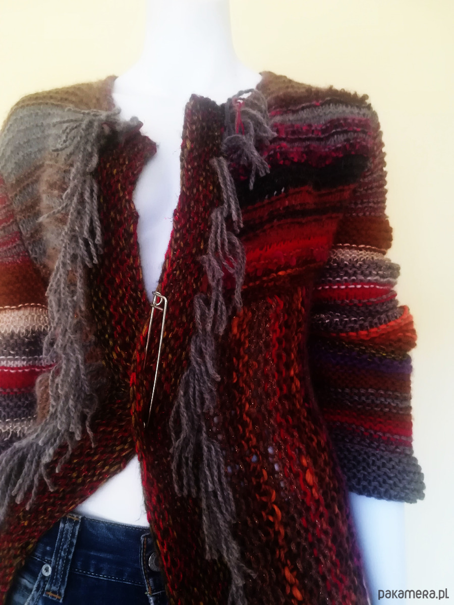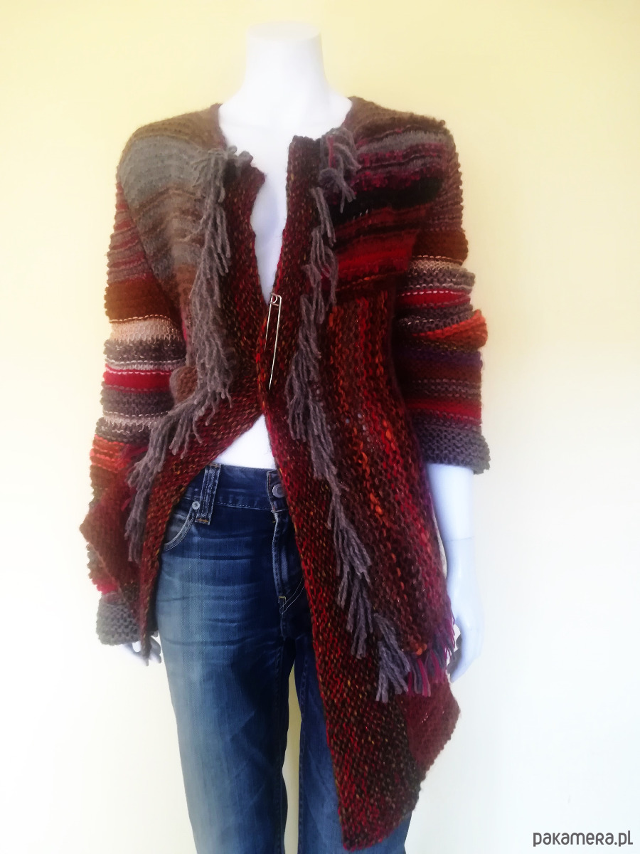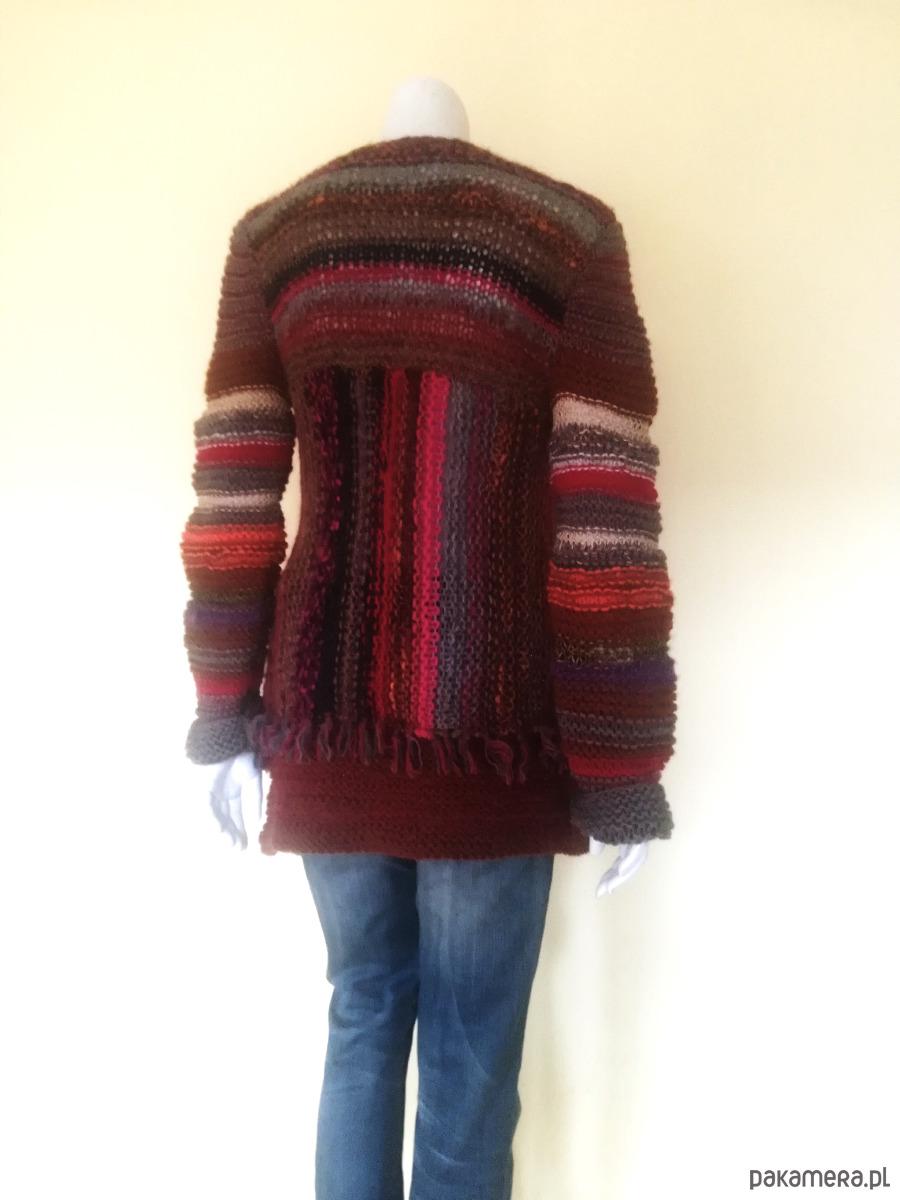 Sweter zrobiony z kolorowych, miękkich włóczek w szerokie pasy o żywej fakturze, luźnym splotem o nierównych oczkach .Pasy u góry swetra poziome, od pachy w dół pionowe. Kolorystyka szlachetnych brązów i beży ożywiona czerwieniami i różami i gdzieniegdzie złotą nitką. Przody swetra wydłużone w stosunku do tyłu , asymetryczne o rożnej długość. Brzegi wykończone frędzlami. Ozdobna, duża agrafka spina przód w dowolnym miejscu. Doskonały element casualowej garderoby w koordynacji z ubraniami dżinsowymi, letnimi sukienkami i szortami .
