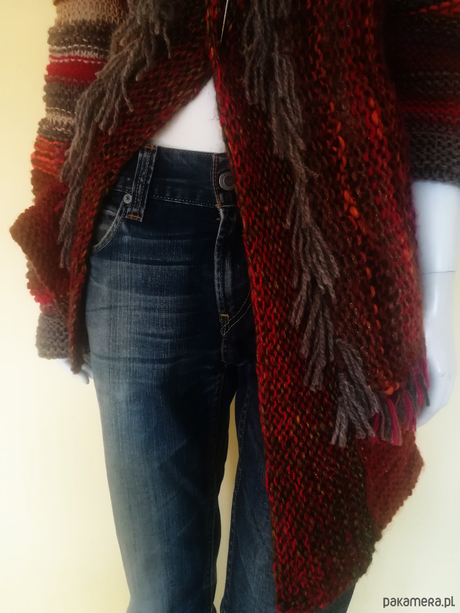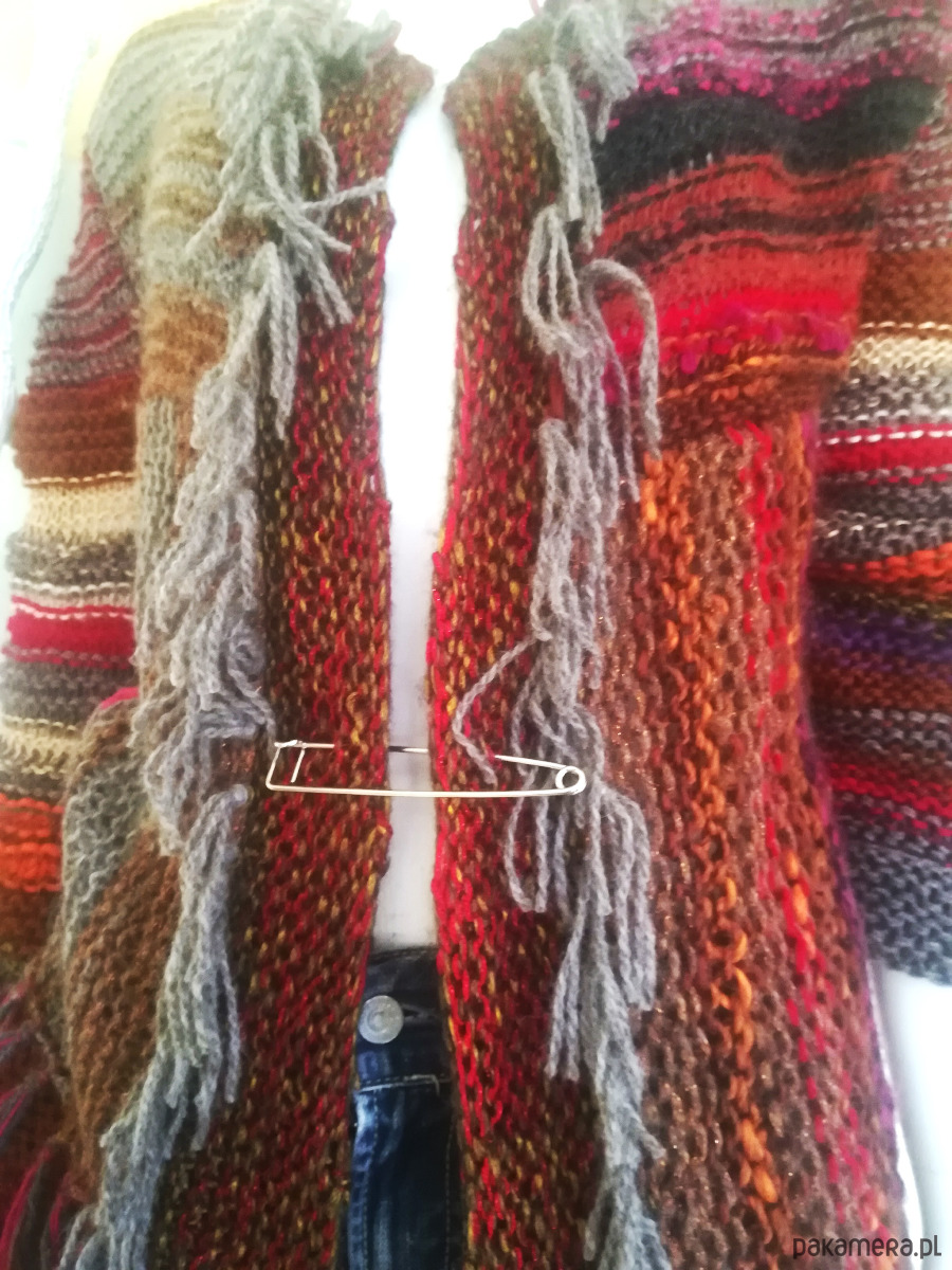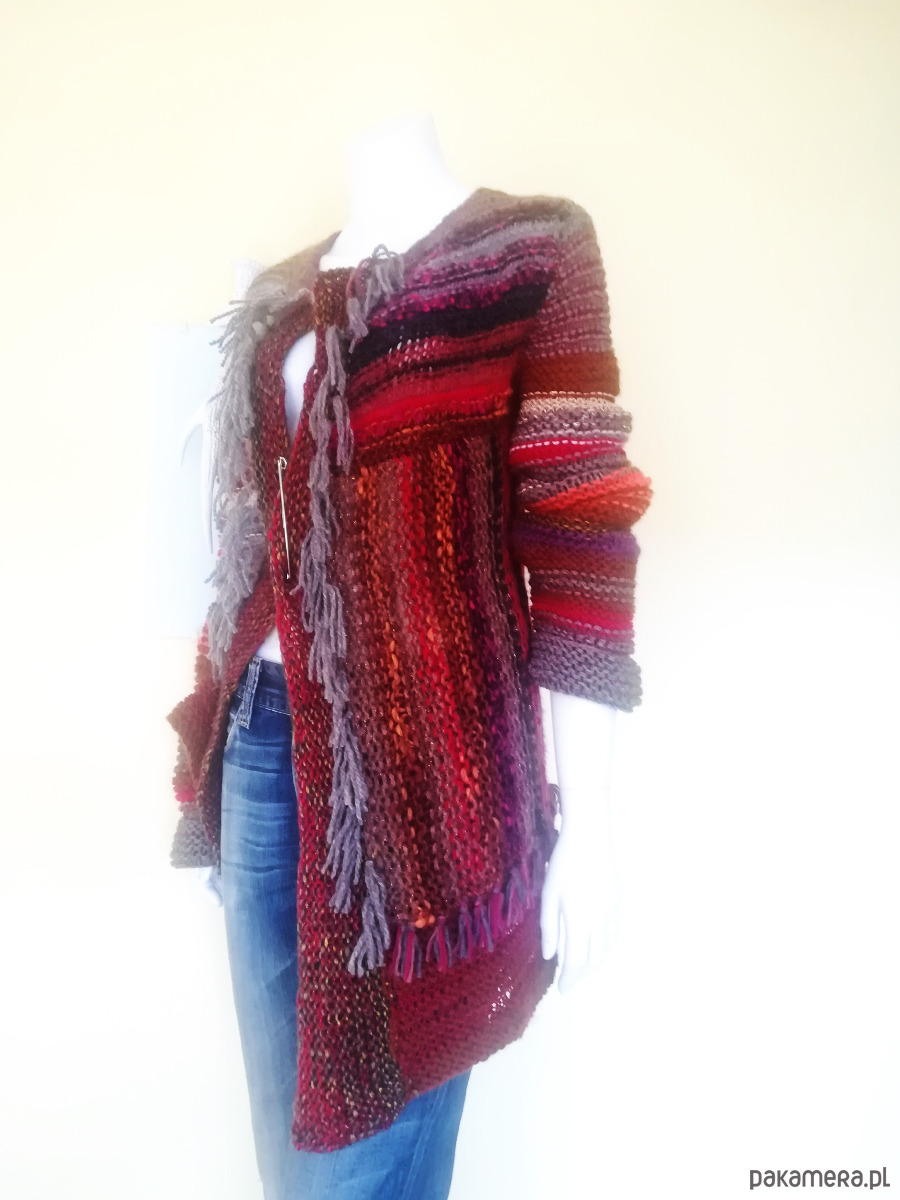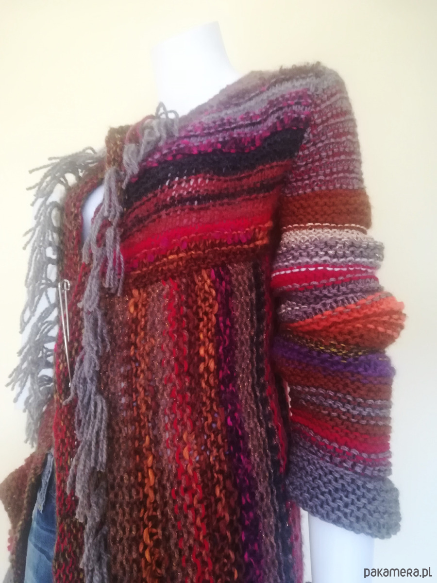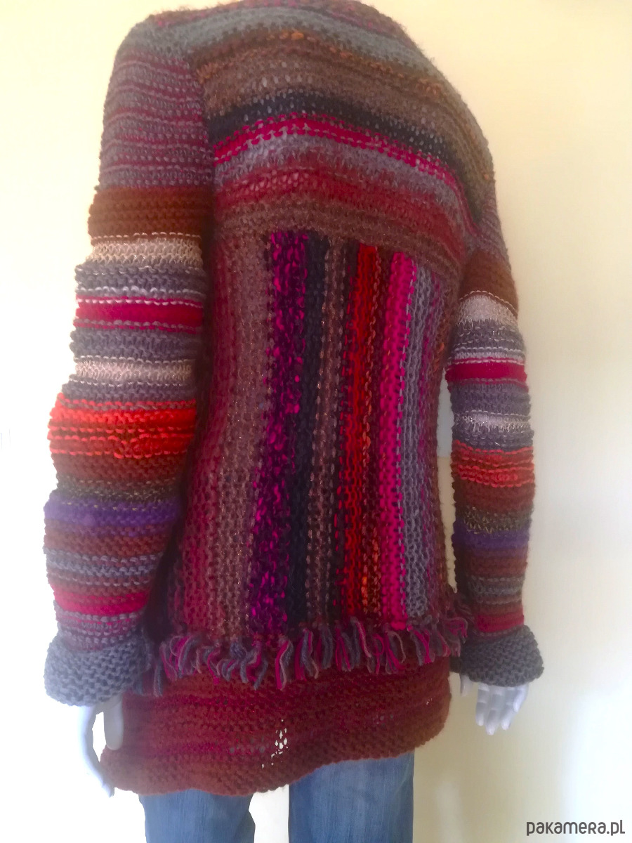 Sweter zrobiony z kolorowych, miękkich włóczek w szerokie pasy o żywej fakturze, luźnym splotem o nierównych oczkach .Pasy u góry swetra poziome, od pachy w dół pionowe. Kolorystyka szlachetnych brązów i beży ożywiona czerwieniami i różami i gdzieniegdzie złotą nitką. Przody swetra wydłużone w stosunku do tyłu , asymetryczne o rożnej długość. Brzegi wykończone frędzlami. Ozdobna, duża agrafka spina przód w dowolnym miejscu. Doskonały element casualowej garderoby w koordynacji z ubraniami dżinsowymi, letnimi sukienkami i szortami .