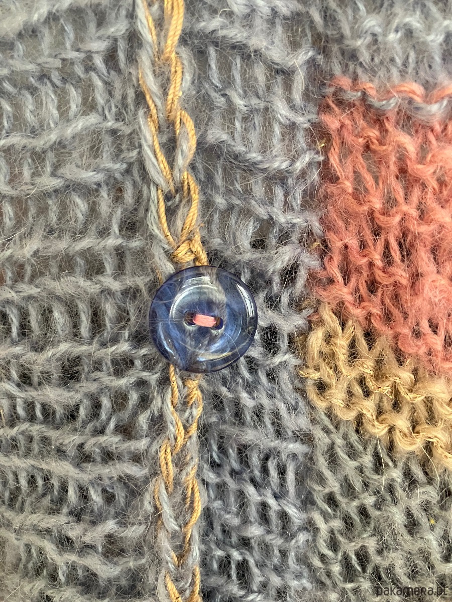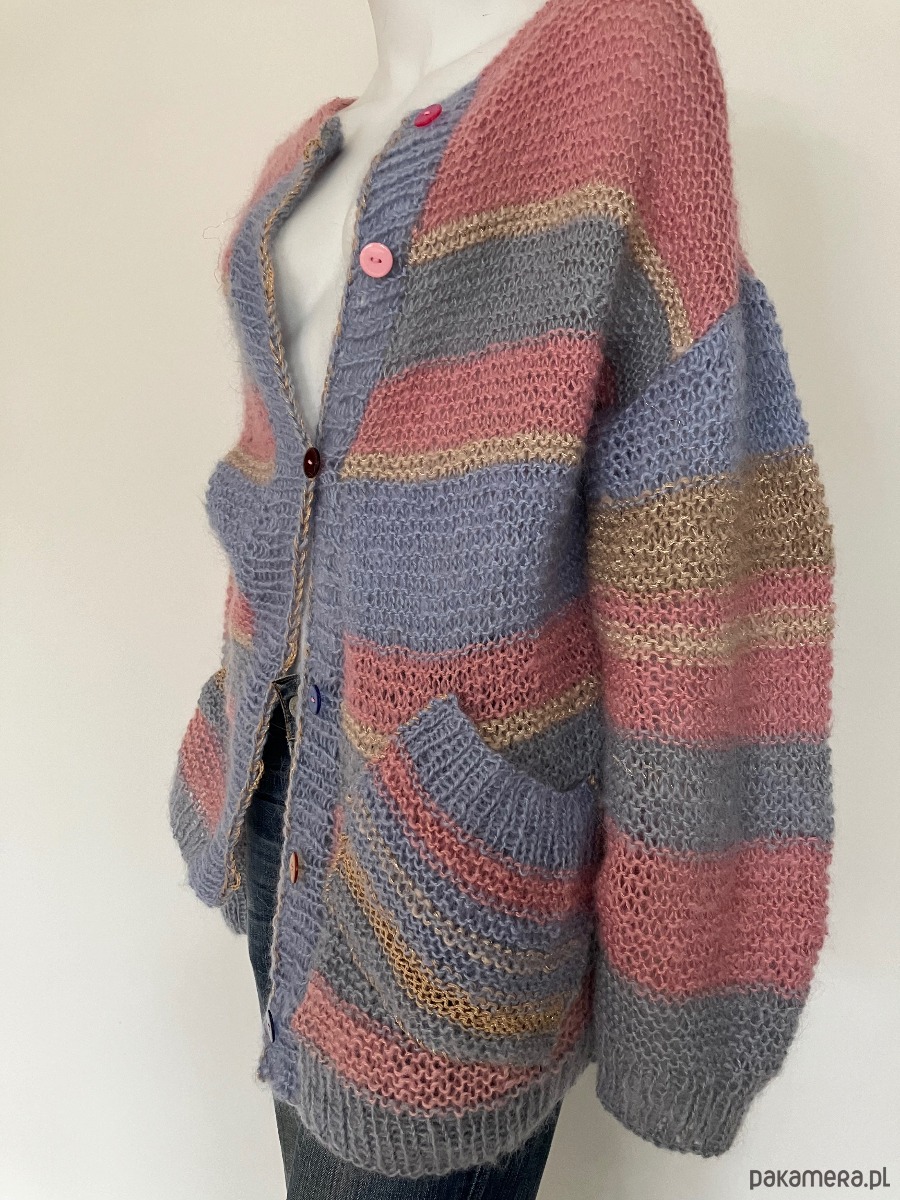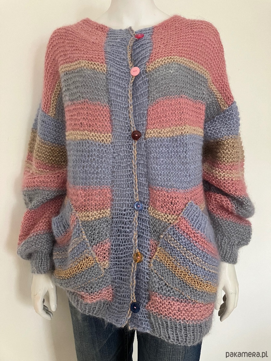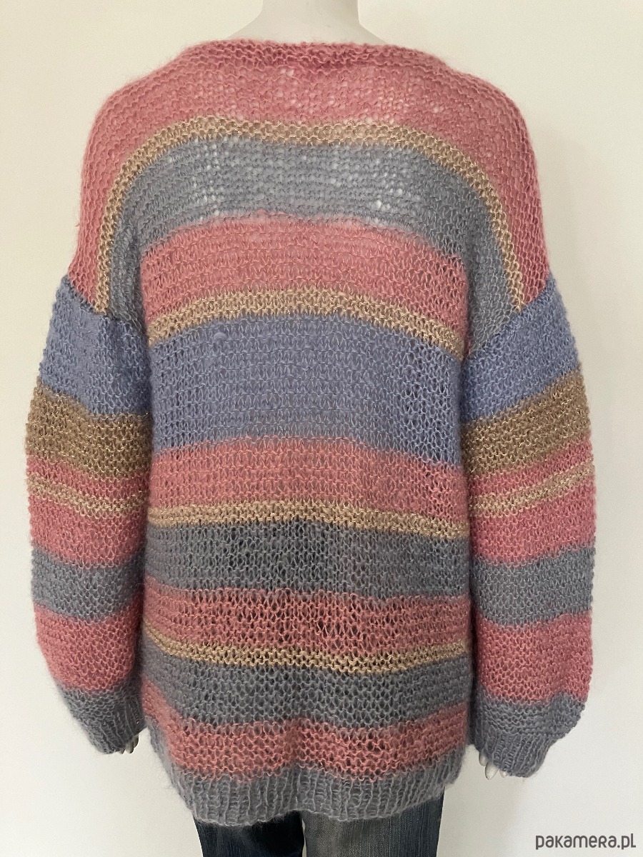 Sweter zrobiony z moherowej włóczki z delikatnym włosem , w kolorowe pasy. Zrobiony luźnym ściegiem. Puszysty i miękki. Forma prosta, luźna . Zapinany na kolorowe guziki średniej wielkości. Rękawy szerokie , zbluzowane na dole, ramię proste, opadające. Sweter doskonale koordynuje się z wiosenno-letnimi ubraniami: dżinsami, spódnicami.