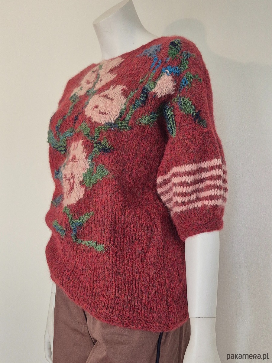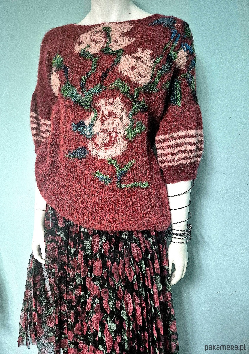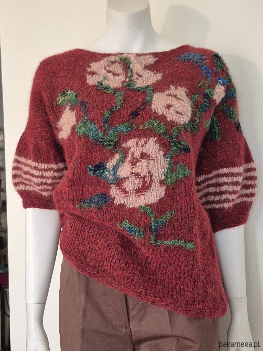 Unikatowy sweter zrobiony ręcznie na drutach ze szlachetnej włóczki, w żywym kolorze czerwonego wina. Przód ozdobiony dekoracyjnymi kwiatami. Prosta ,miękka forma swetra. Sweter bardzo delikatny, lekki a jednocześnie bardzo ciepły...Sweter stworzony do koordynacji z dżinsami lub innymi spodniami i spódnicami w stylu casual.i eleganckimi .Ponadczasowy, doskonały na prezent dla osób oryginalnych, ceniących ubrania niepowtarzalne i szlachetne. Styl boho.
