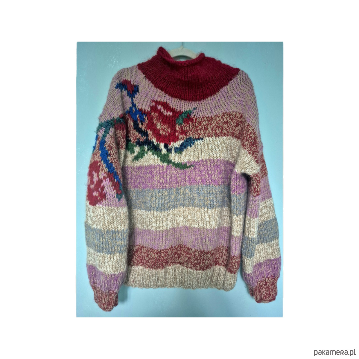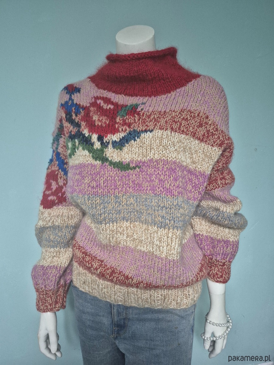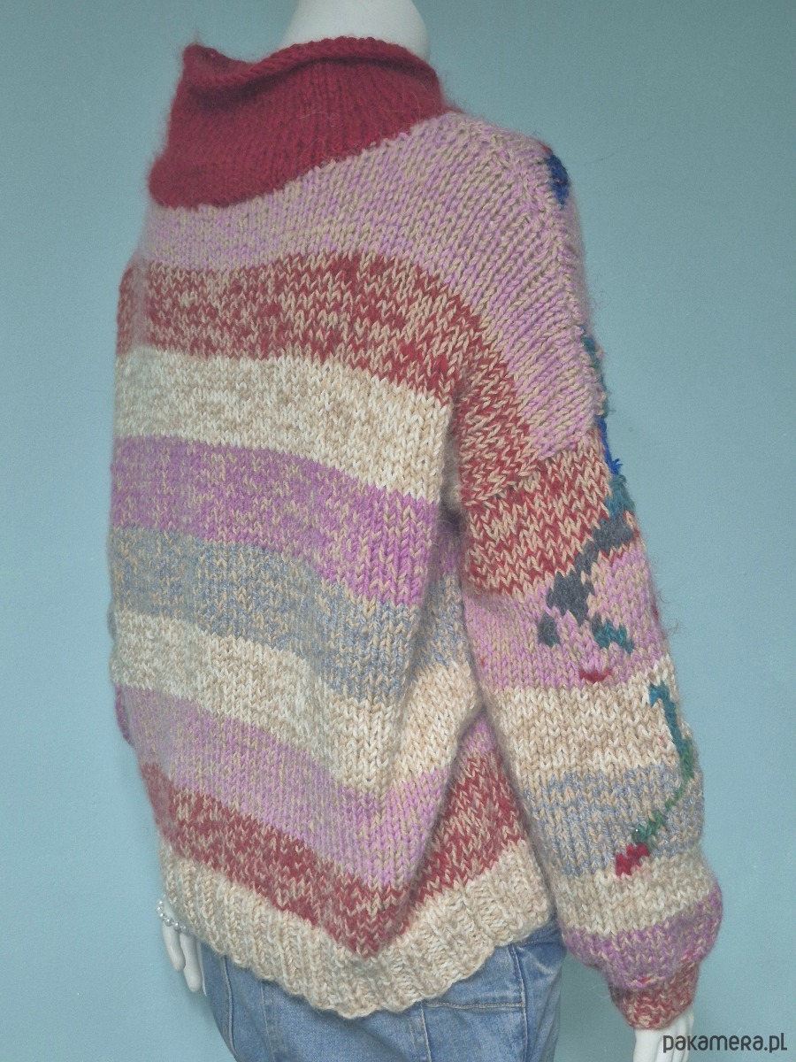 Unikatowy sweter zrobiony ręcznie na drutach ze szlachetnej włóczki, w kolorowe, pastelowe pasy. Przód ozdobiony dekoracyjnymi kwiatami przechodzącyimi na rękaw. Prosta ,miękka forma swetra. Sweter bardzo ciepły...Sweter stworzony do koordynacji z dżinsami lub innymi spodniami i spódnicami w stylu casual.i eleganckimi .Ponadczasowy, doskonały na prezent dla osób oryginalnych, ceniących ubrania niepowtarzalne i szlachetne. Styl boho.
