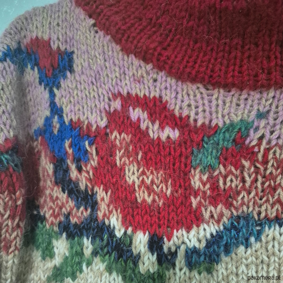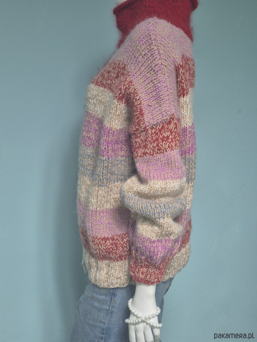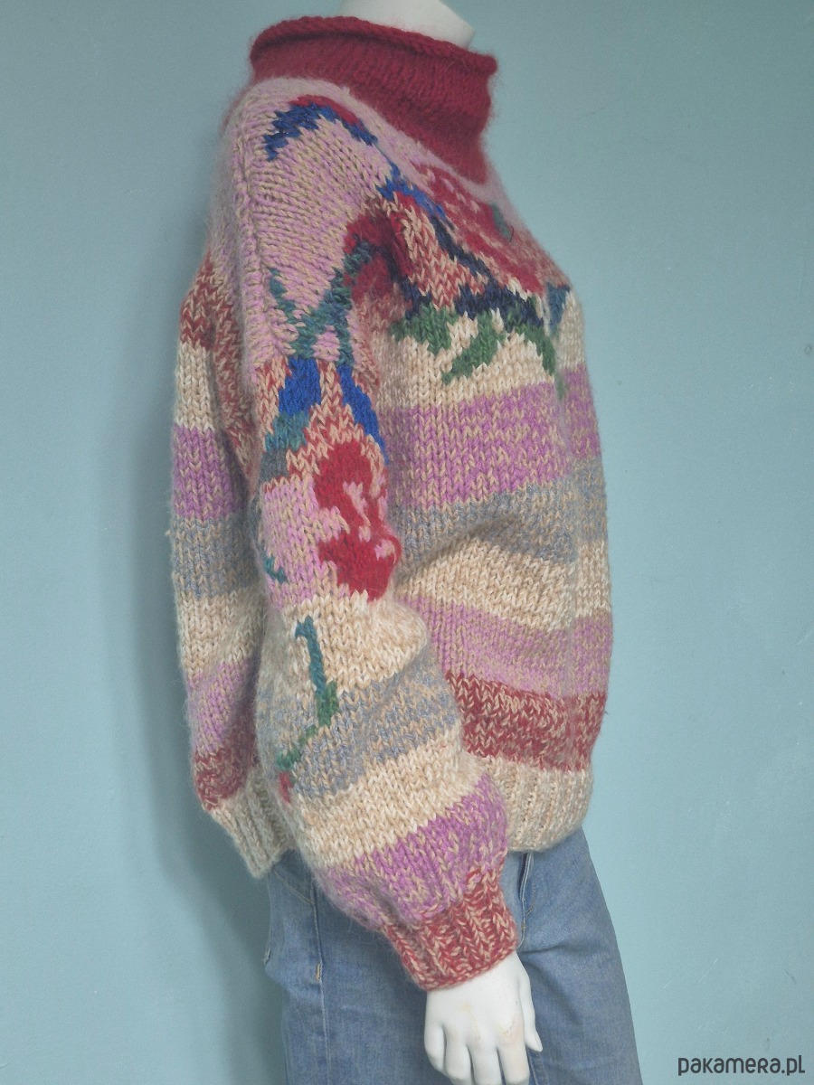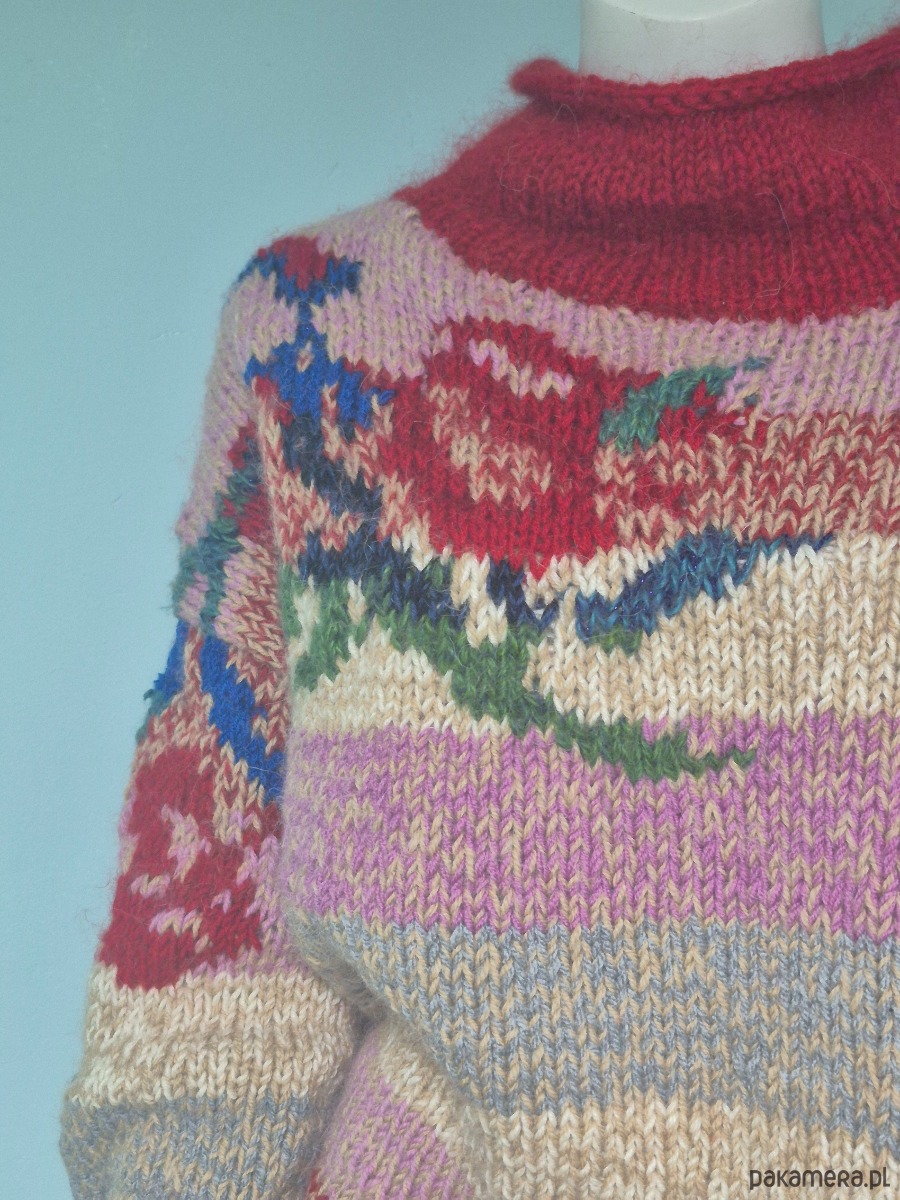 Unikatowy sweter zrobiony ręcznie na drutach ze szlachetnej włóczki, w kolorowe, pastelowe pasy. Przód ozdobiony dekoracyjnymi kwiatami przechodzącyimi na rękaw. Prosta ,miękka forma swetra. Sweter bardzo ciepły...Sweter stworzony do koordynacji z dżinsami lub innymi spodniami i spódnicami w stylu casual.i eleganckimi .Ponadczasowy, doskonały na prezent dla osób oryginalnych, ceniących ubrania niepowtarzalne i szlachetne. Styl boho.