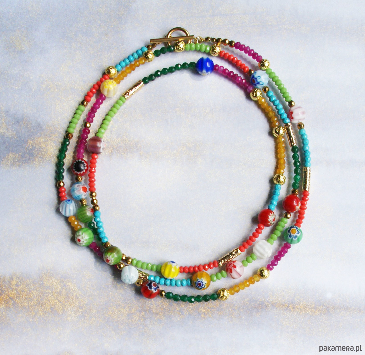 Ten UNIKATOWY sznur korali ma długość aż 120cm powstał ze starannie dobranych baaardzo kolorowych komponentów (jadeit fasetowany 4mm w różnych kolorach, porowata lawa złota, wysokiej jakości szkło millefiori 10mm, złoty hematyt, elementy metalowe wykonane ze stali szlachetnej pozłacanej).