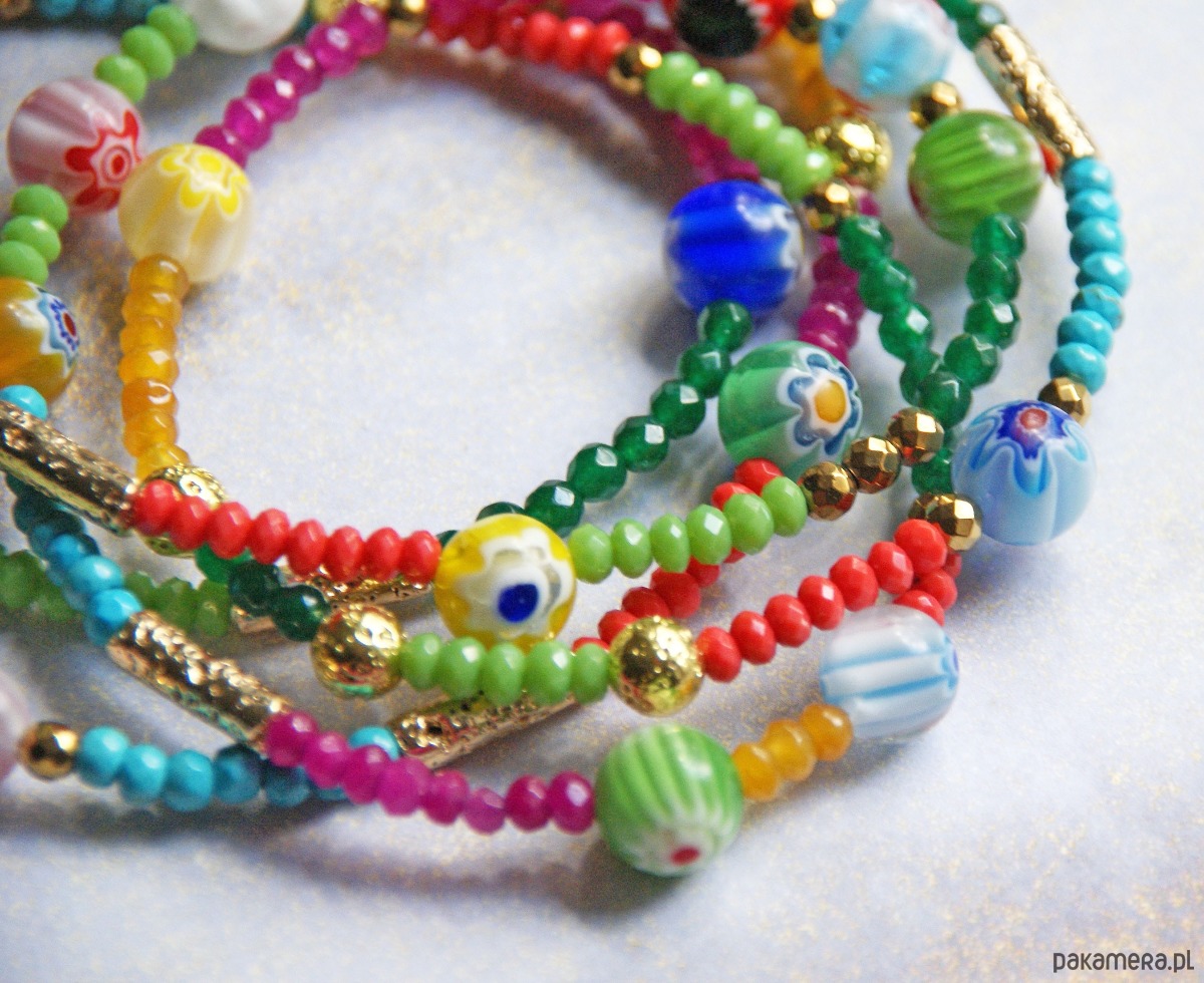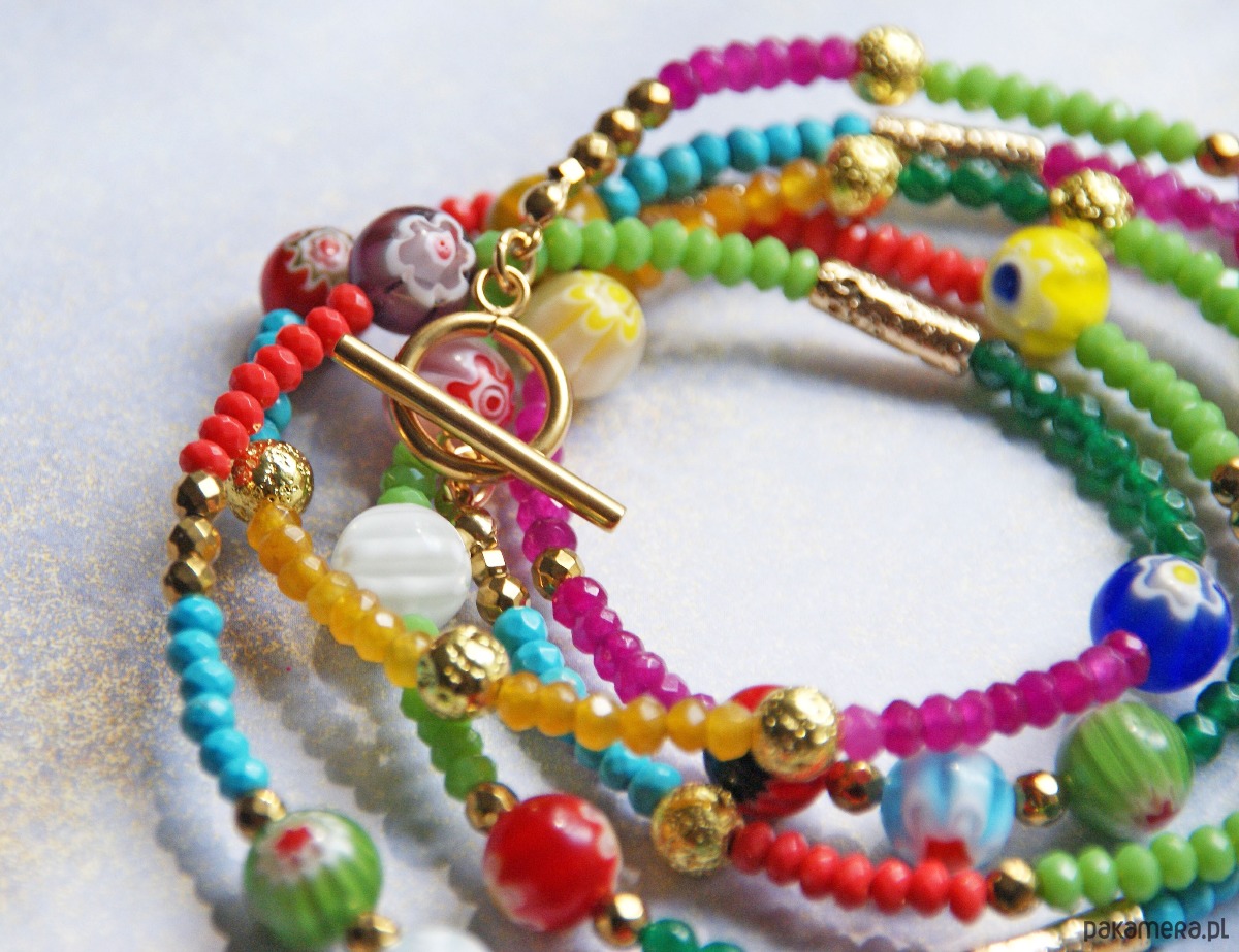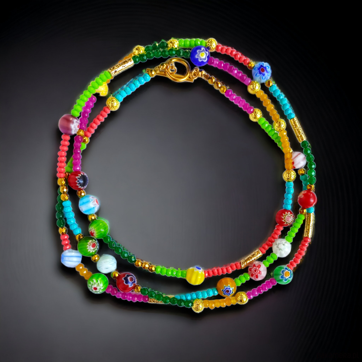 Ten UNIKATOWY sznur korali ma długość aż 120cm powstał ze starannie dobranych baaardzo kolorowych komponentów (jadeit fasetowany 4mm w różnych kolorach, porowata lawa złota, wysokiej jakości szkło millefiori 10mm, złoty hematyt, elementy metalowe wykonane ze stali szlachetnej pozłacanej).