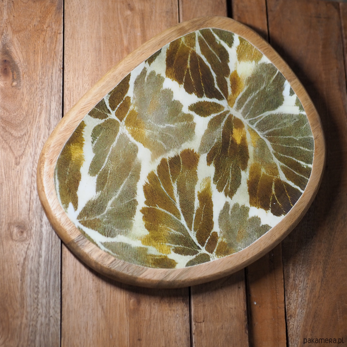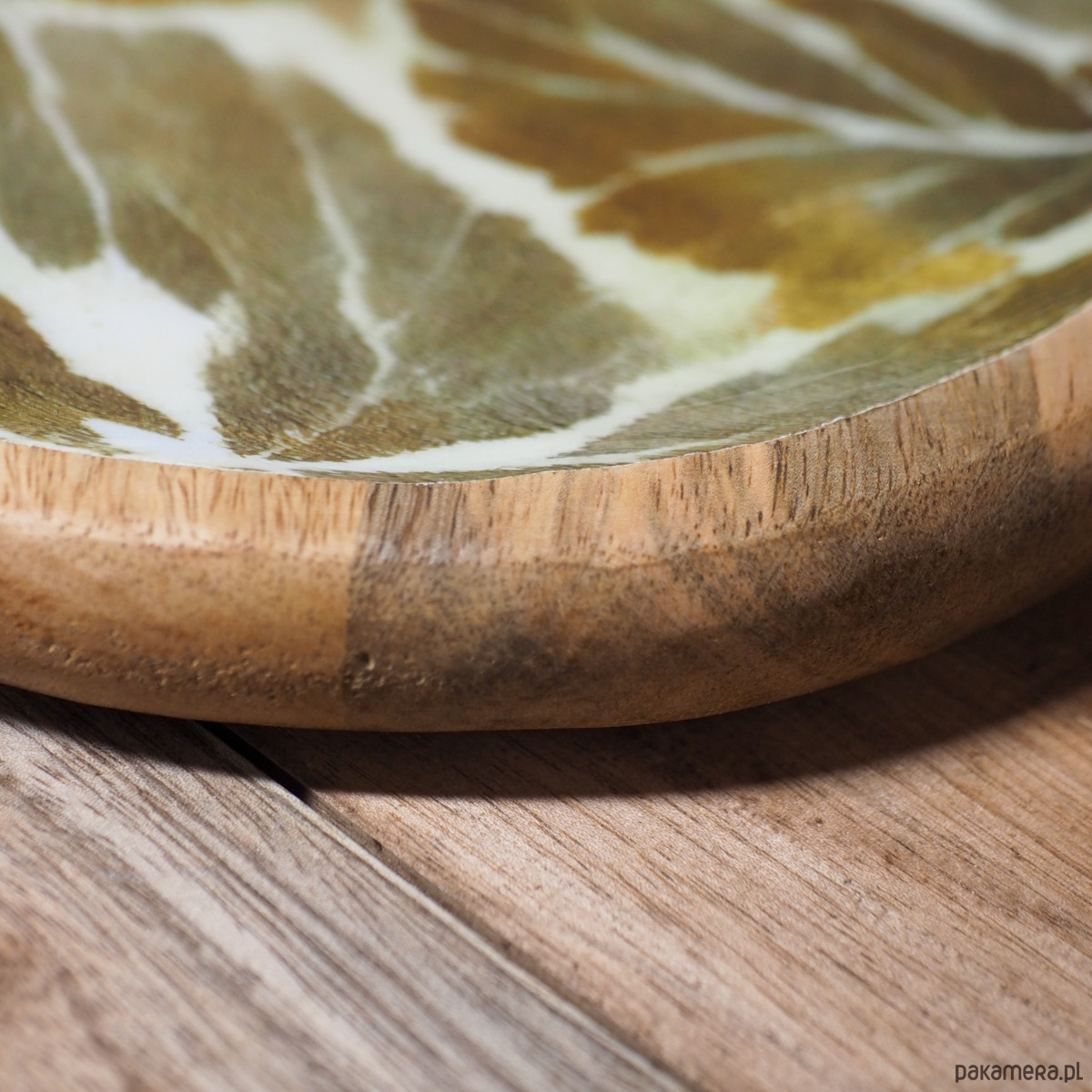 Talerz łączy surowe piękno litego drewna mango z delikatnością ceramicznej wkładki. Drewniana baza ma naturalne słoje i nieregularny kształt. Wewnątrz ceramiczny insert z subtelnym wzorem jesiennych liści.
