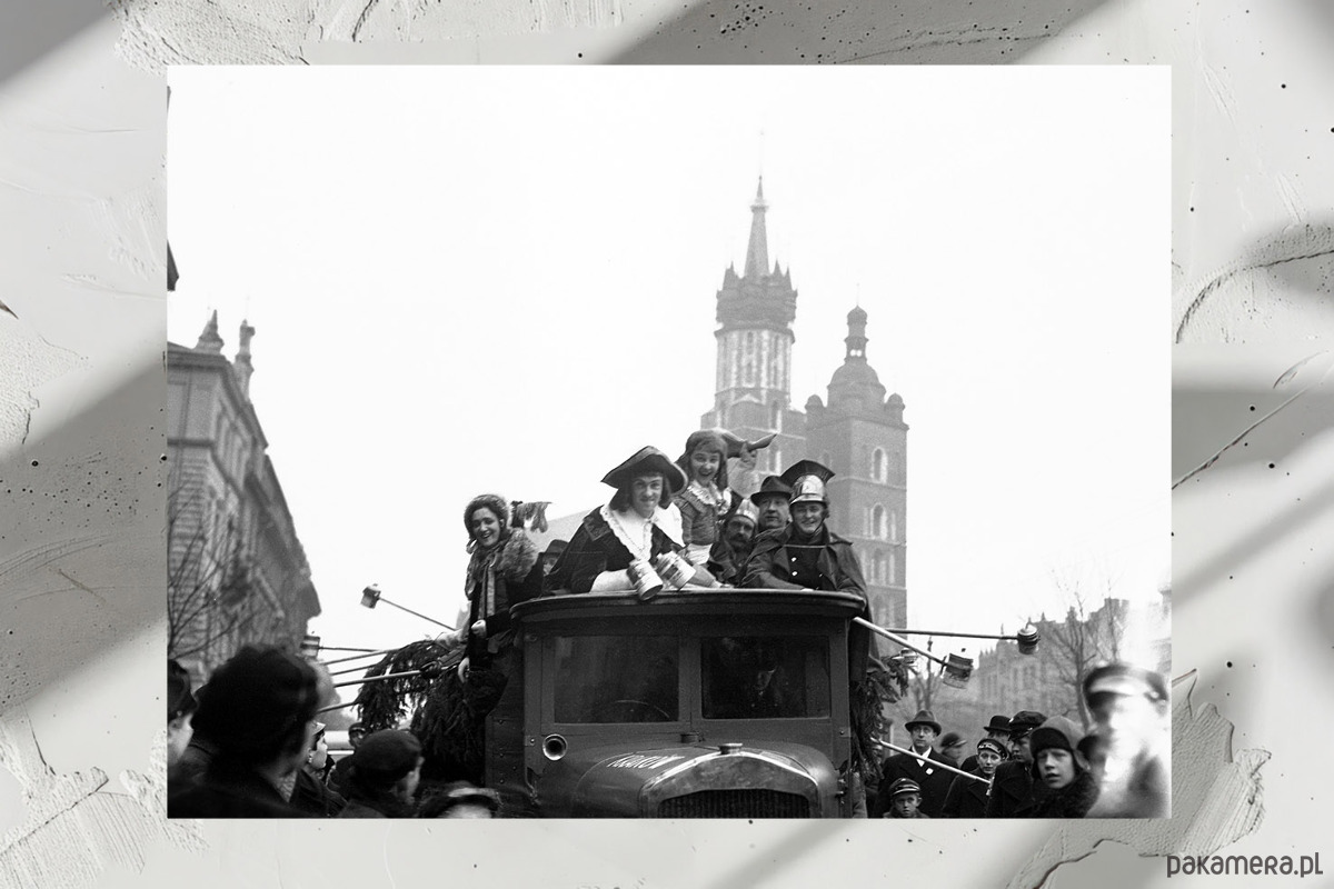 Zdjęcie wykonane podczas zbiórki na rzecz bezrobotnych w 1937 roku. Opis z tabliczki: Aktorzy Teatru im. Słowackiego, przebrani w stroje sceniczne, biorą udział w paradzie zorganizowanej w ramach akcji „Święty Mikołaj dla dzieci bezrobotnych”. Oprócz pochodu odbywały się także przedstawienia i koncerty, które miały na celu wsparcie rodzin dotkniętych skutkami kryzysu gospodarczego.