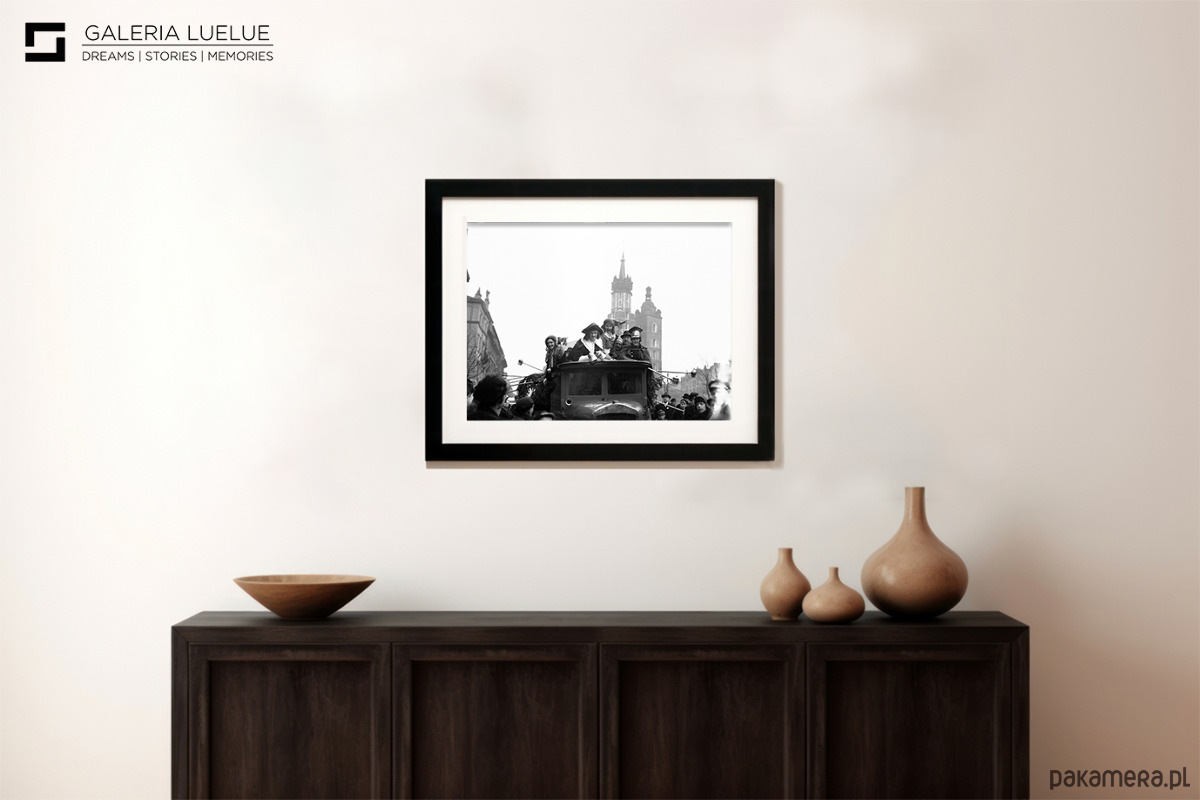 Oryginalny wydruk fotograficzny z wystawy "Kraków Stories 2025", która miała miejsce 29 maja w Galerii LueLue przy ul. Miodowej 22 w Krakowie. Fotografia została wykonana na papierze barytowym, co gwarantuje najwyższą jakość i głębię tonalną. Dla wzmocnienia i elegancji podklejona jest od spodu włoskim passe-partout. Z tyłu znajduje się tabliczka z opisem, pochodząca bezpośrednio z ekspozycji. Zdjęcie przedstawia archiwalną scenę z życia artystycznego Krakowa.