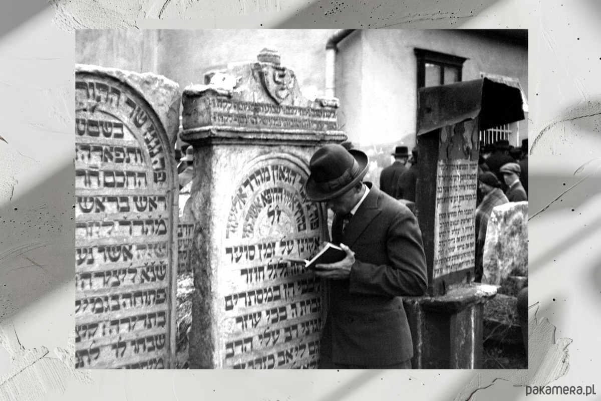 Zdjęcie przedstawia scenę sprzed niemal stu lat z cmentarza Remuh na krakowskim Kazimierzu. Opis z tabliczki: Cmentarz Remuh wypełnia się modlitwami, a wierni gromadzą się przy grobie rabina, wypisując prośby i wkładając je w szczeliny grobowca. W 1931 roku reporter „Światowida” opisał „Dzień rabina Remu” jako czas intensywnych modlitw i żebractwa przed cmentarzem. Te same miejsca — cmentarz, grób rabina i synagoga — istnieją do dziś, mimo że twarze ówczesnych krakowskich Żydów pozostały jedynie na archiwalnych fotografiach. Obchody Święta Rabi’a Remu, choć zmienione, nadal przypominają o tradycji i historii Kazimierza.