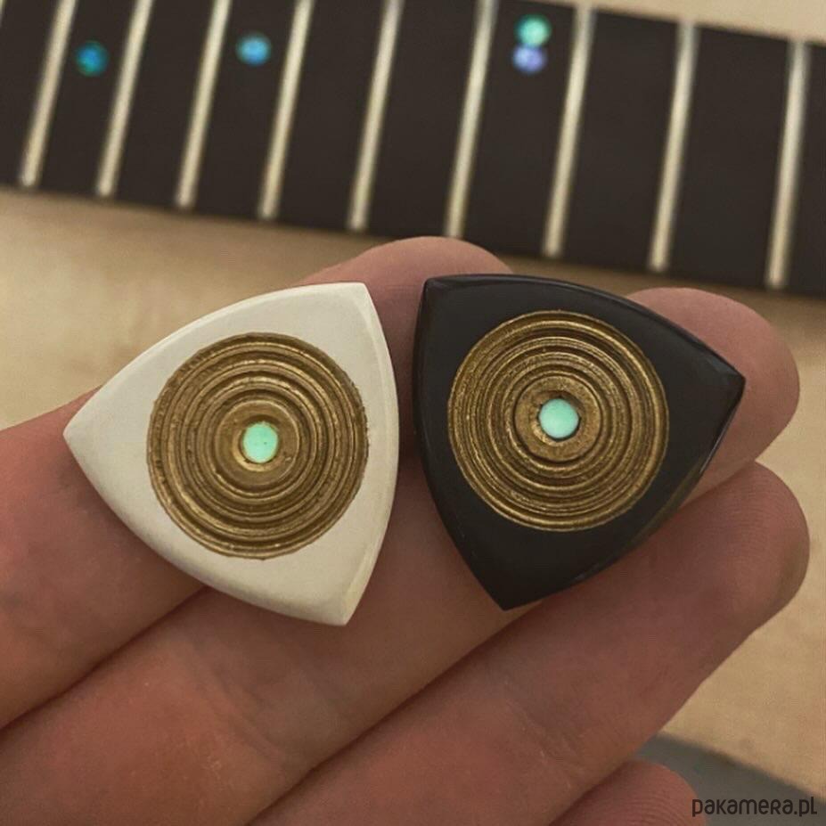 High quality handmade guitar pick made of polyetheretherketone. It features a very good grip thanks to the four drilled circles painted with abrasion-resistant oil paint. In the central part I placed fluorescent material.. A very comfortable, long lasting and good sounding tool for the guitarist.