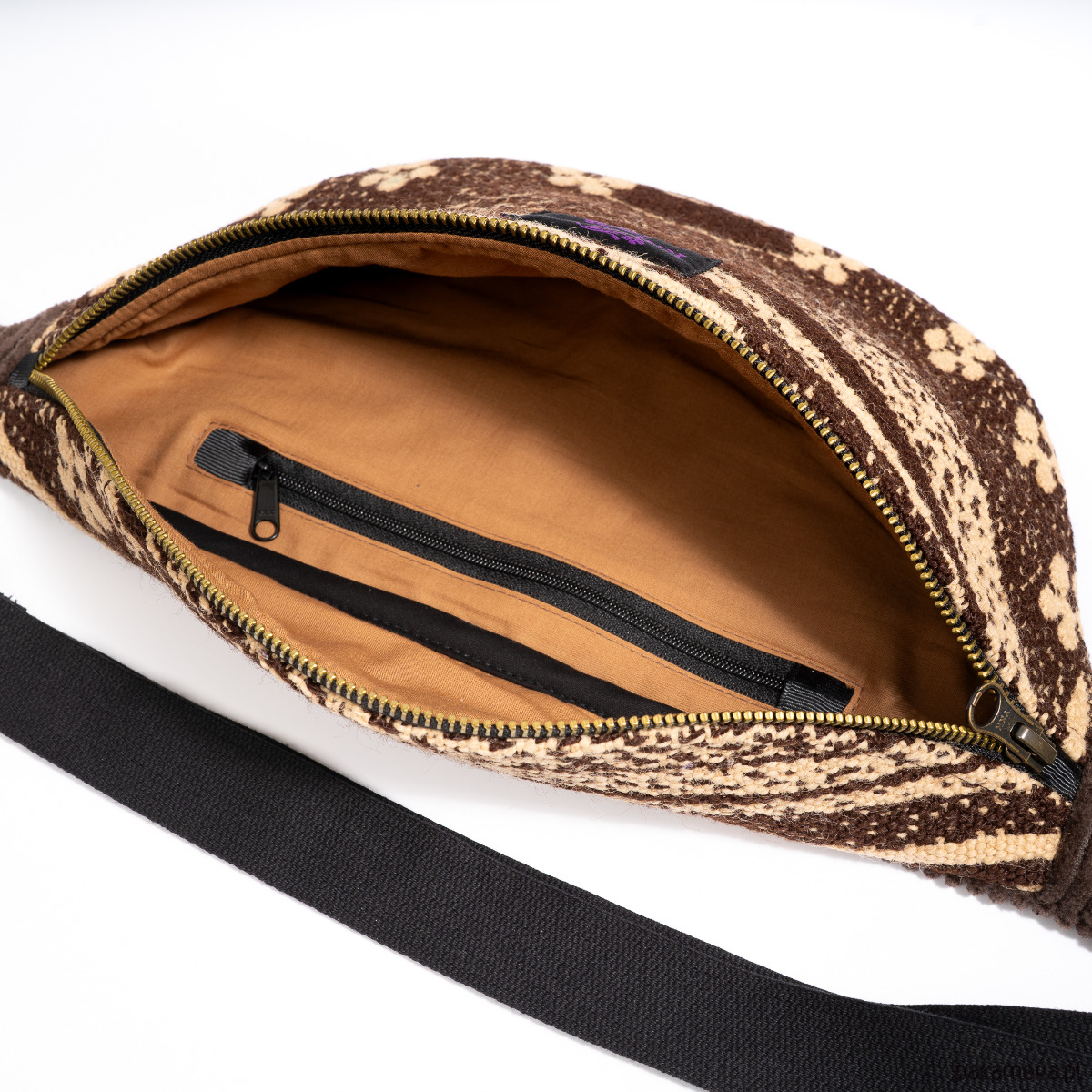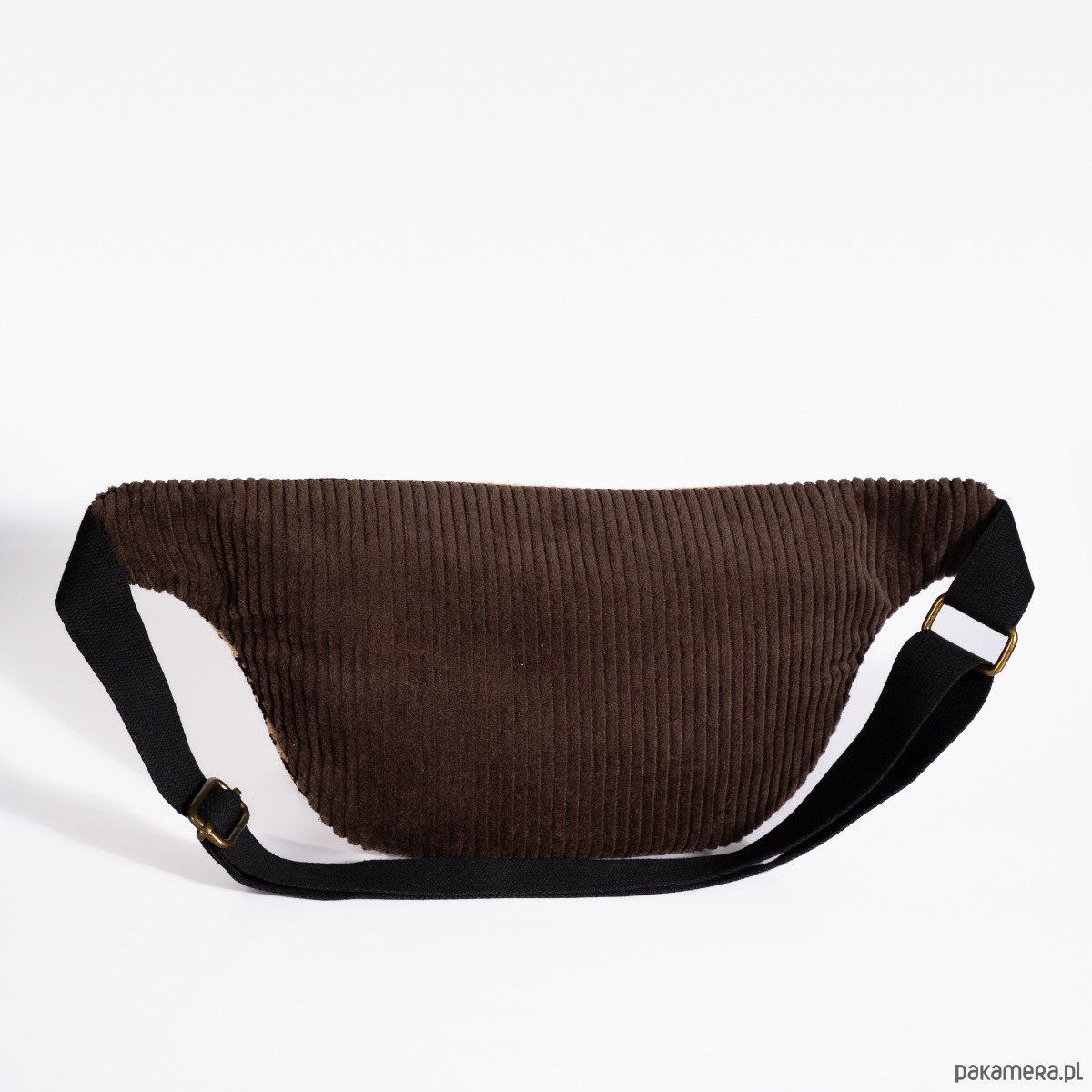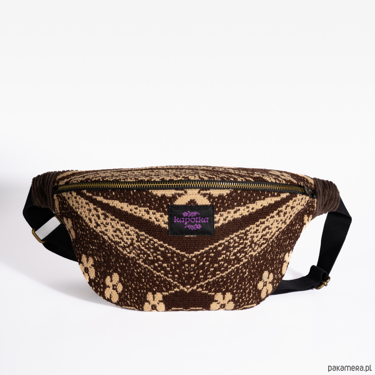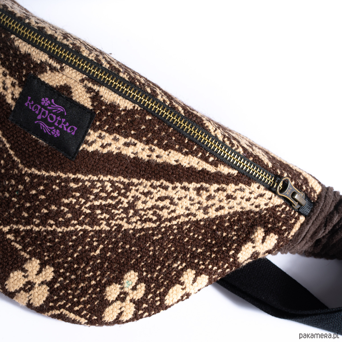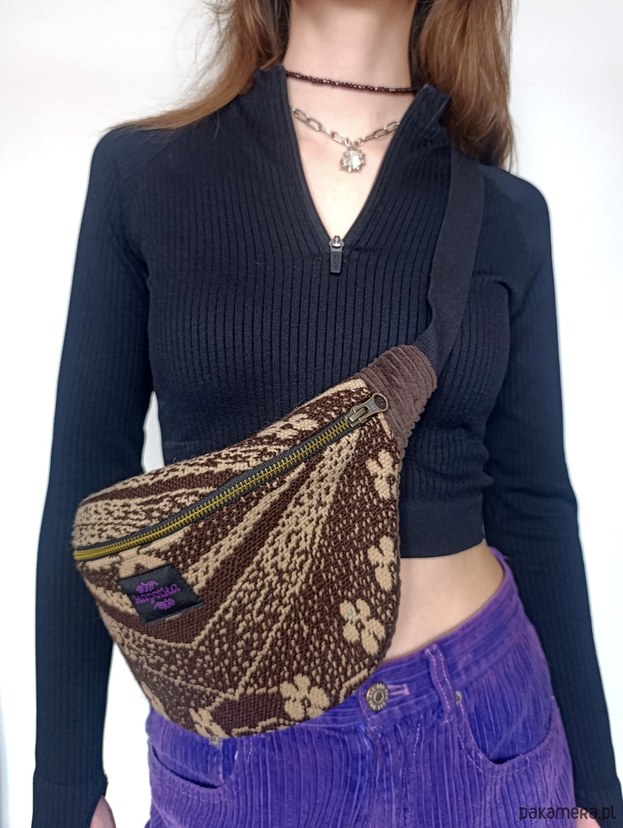 Upcyclingowa nerka z regulowanym paskiem. Przód uszyty jest z pięknej, wzorzystej tkaniny z okresu PRL-u. Tył z bawełnianego sztruksu w brązowym kolorze. Zapinana na porządny metalowy zamek firmy YKK. W środku dodatkowa kieszonka zapinana na suwak. Czarny pasek, miękki i wytrzymały, z parcianej taśmy bawełnianej. W środku wykończone bawełniną podszewką. Elementy kaletnicze pochodzą od polskiego producenta, są metalowe i wysokiej jakości. w kolorze starego złota.