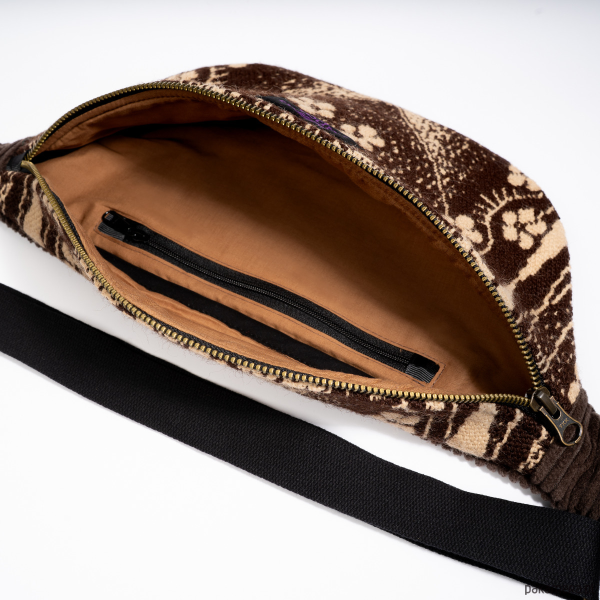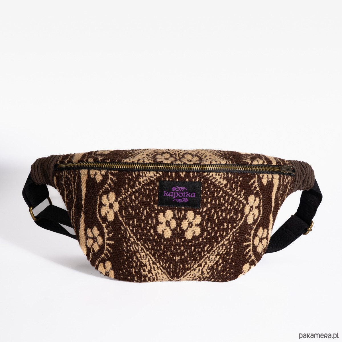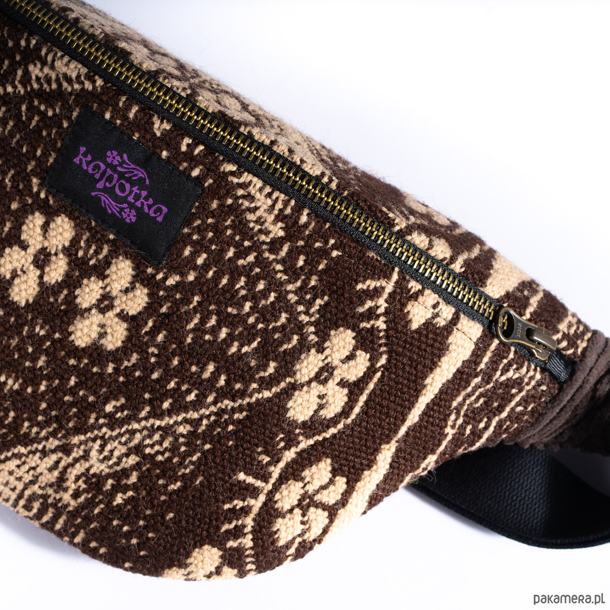 Upcyclingowa nerka z regulowanym paskiem. Przód uszyty jest z pięknej, wzorzystej tkaniny z okresu PRL-u. Tył z bawełnianego sztruksu w brązowym kolorze. Zapinana na porządny metalowy zamek firmy YKK. W środku dodatkowa kieszonka zapinana na suwak. Czarny pasek, miękki i wytrzymały, z parcianej taśmy bawełnianej. W środku wykończone bawełniną podszewką. Elementy kaletnicze pochodzą od polskiego producenta, są metalowe i wysokiej jakości. w kolorze starego złota.