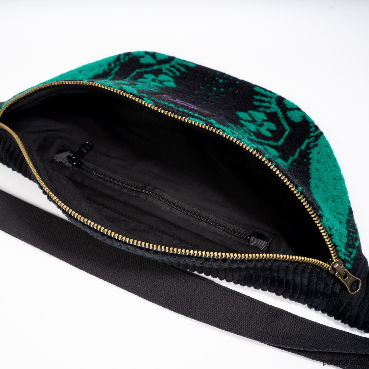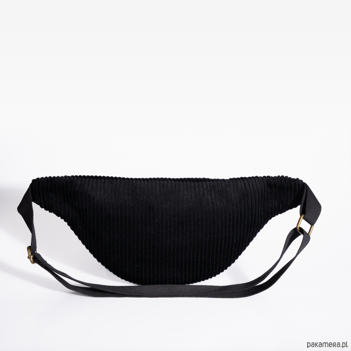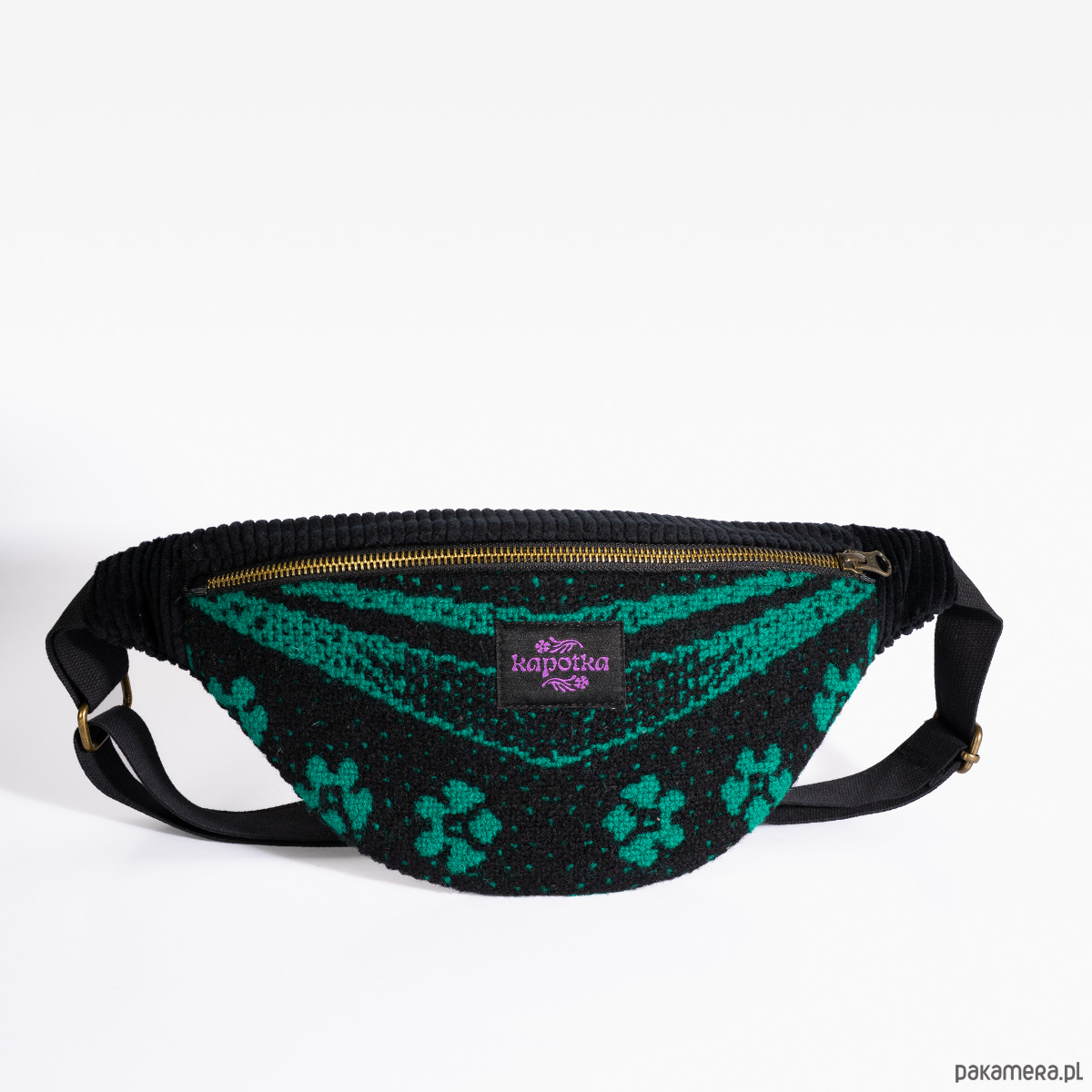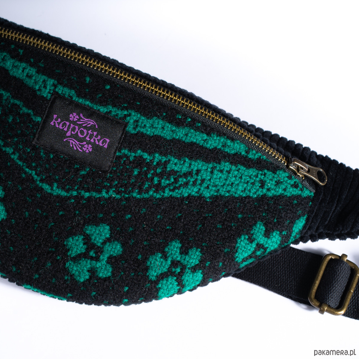 Upcyclingowa nerka z regulowanym paskiem. Przód uszyty jest z pięknej, wzorzystej, ludowej tkaniny z okresu PRL-u. Tył z bawełnianego sztruksu w czarnym kolorze. Zapinana na porządny metalowy zamek firmy YKK. W środku dodatkowa kieszonka zapinana na suwak. Czarny pasek, miękki i wytrzymały, z parcianej taśmy bawełnianej. W środku wykończone bawełniną podszewką. Elementy kaletnicze pochodzą od polskiego producenta, są metalowe i wysokiej jakości. w kolorze starego złota.